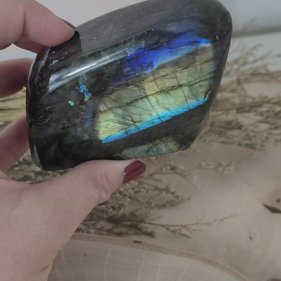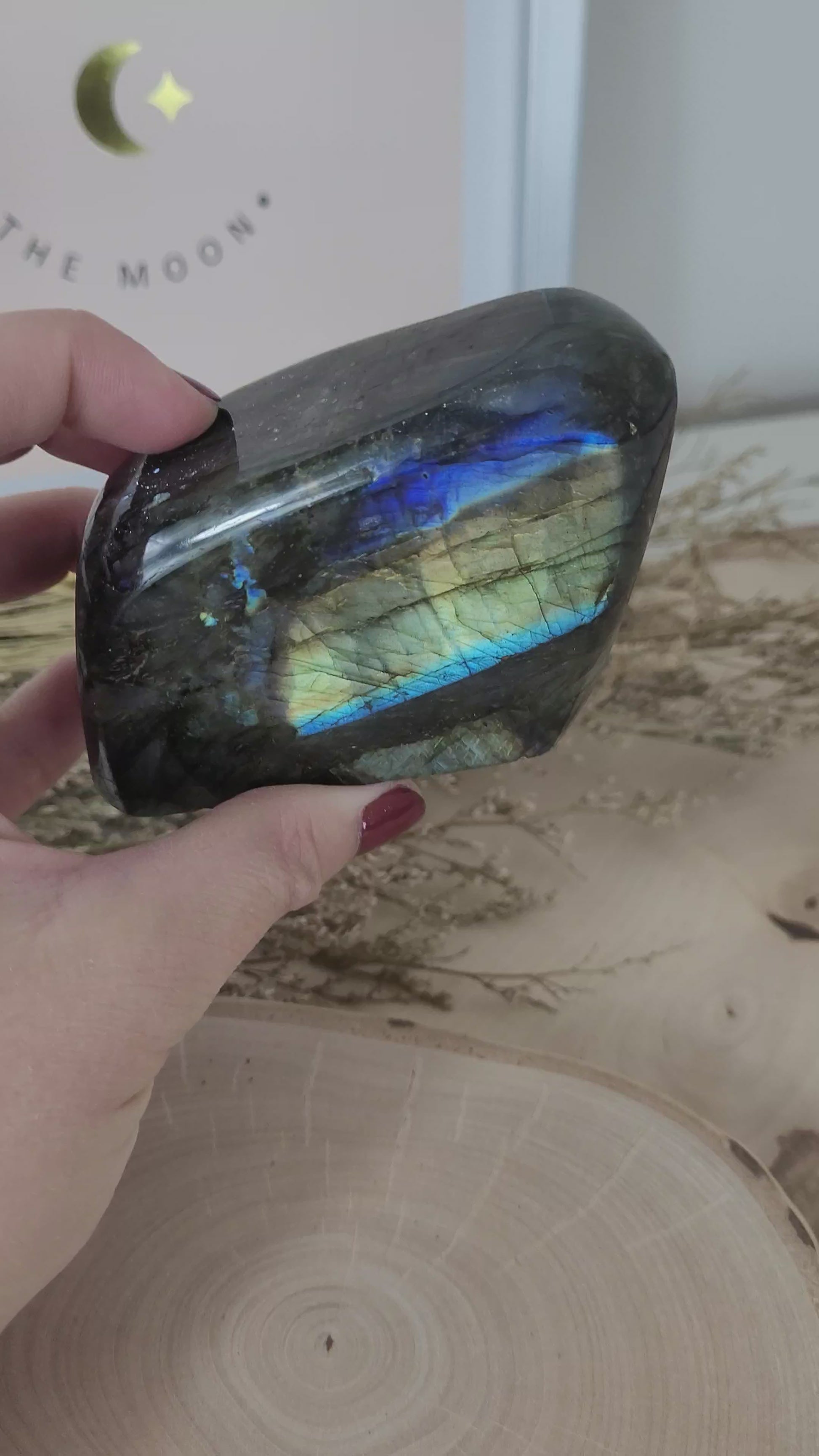 Die Labradorit Freiform hat eine Größe von 6,3 x 8 cm und wiegt 360g. Es handelt sich genau um die Labradorit Freiform, die auf den Bildern zu sehen ist.