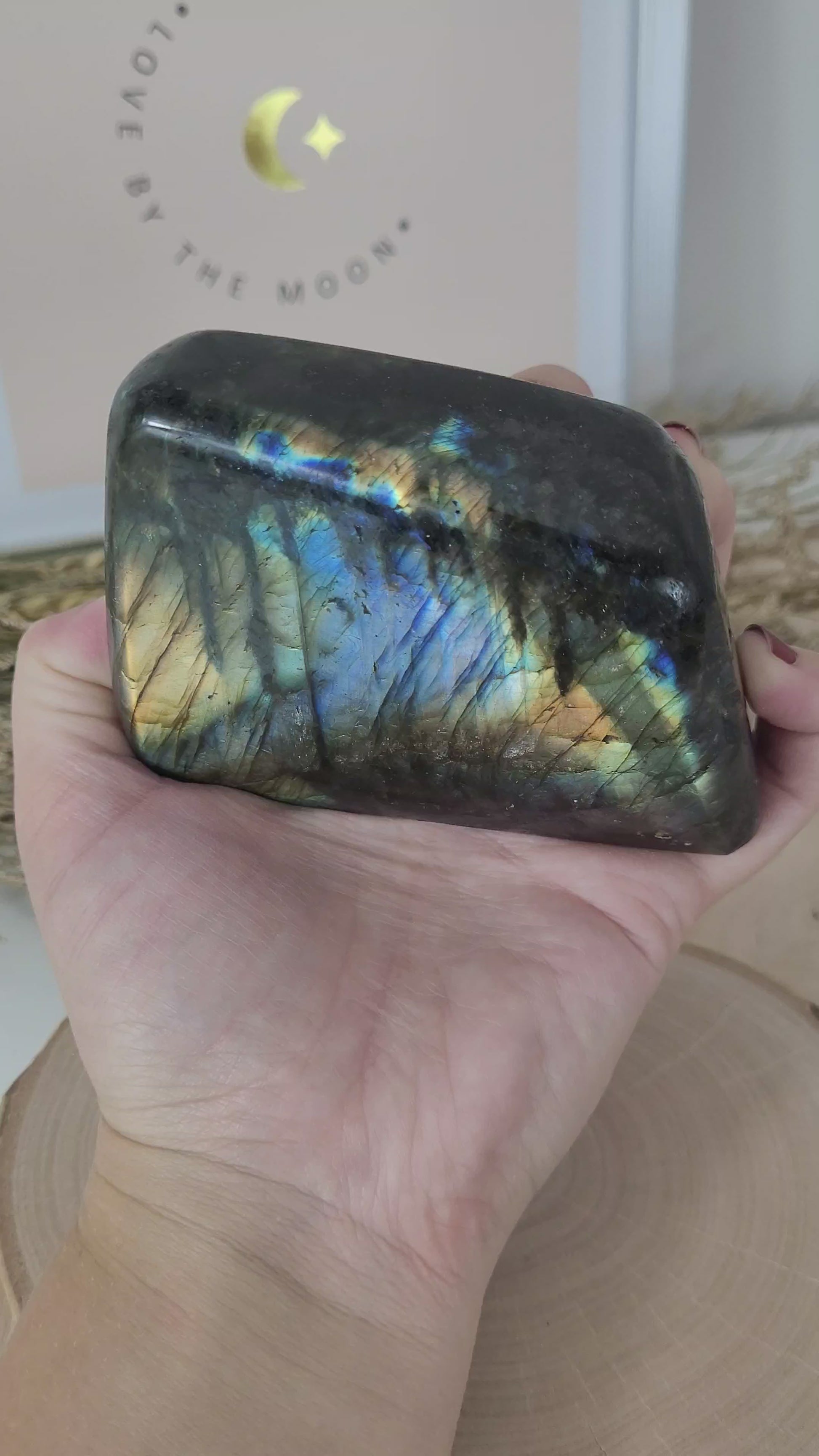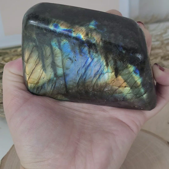 Die Labradorit Freiform hat eine Größe von 6,6 x 9,2 cm und wiegt 481g. Es handelt sich genau um die Labradorit Freiform, die auf den Bildern zu sehen ist.