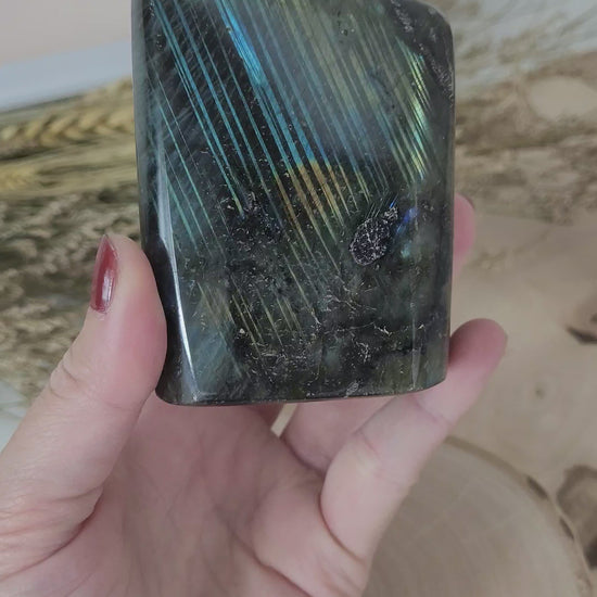 Diese wunderschöne Labradorit Freiform fasziniert mit ihrem sehr intensiven Naturfarbenspiel bei Lichteinfall in den einzelnen Lamellenschichten des Labradorits.