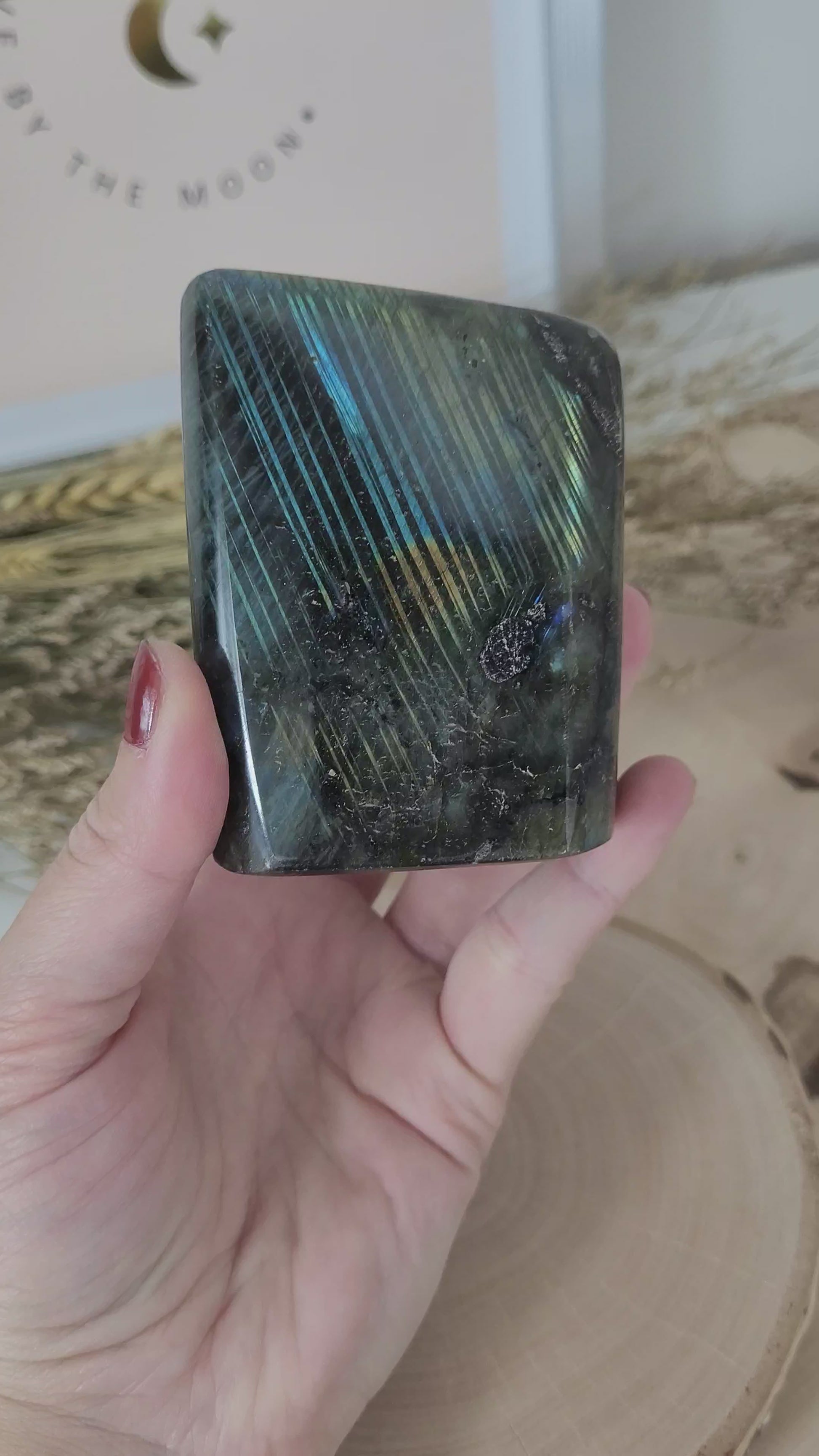 Die Labradorit Freiform hat eine Größe von 7,4 x 5,4 cm und wiegt 368g. Es handelt sich genau um die Labradorit Freiform, die auf den Bildern zu sehen ist.