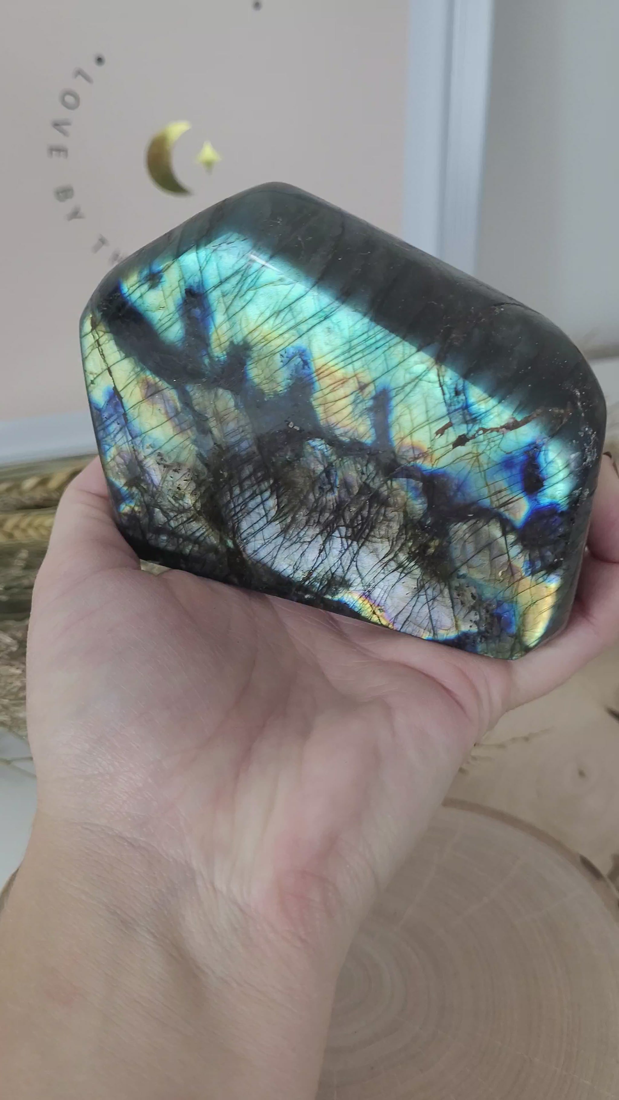 Die Labradorit Freiform hat eine Größe von 7,8 x 9,8 cm und wiegt 612g. Es handelt sich genau um die Labradorit Freiform, die auf den Bildern zu sehen ist.