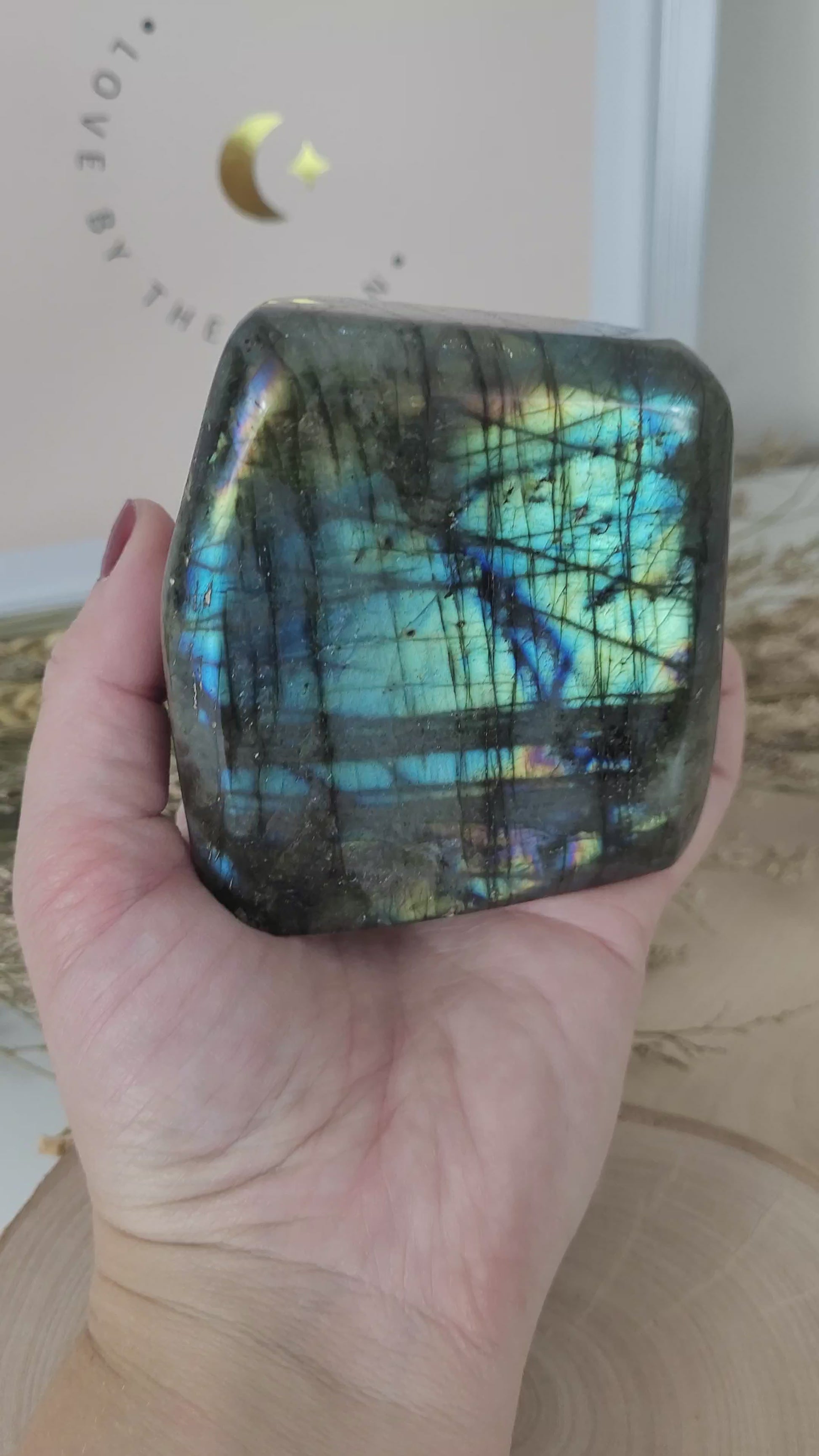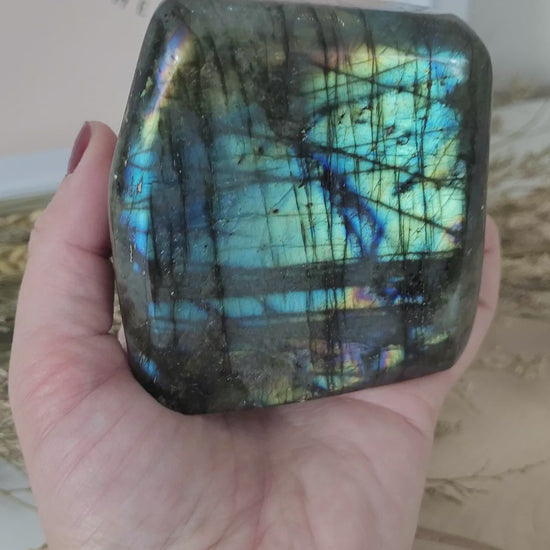 Die Labradorit Freiform hat eine Größe von 8,1 x 7,3 cm und wiegt 547g. Es handelt sich genau um die Labradorit Freiform, die auf den Bildern zu sehen ist.