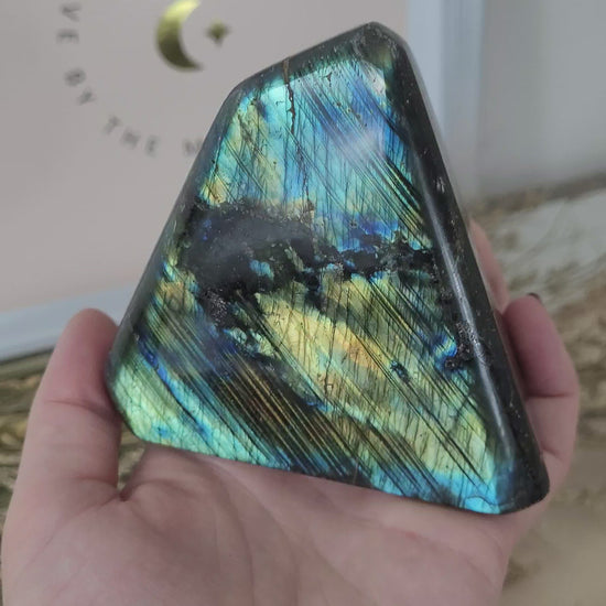 Die Labradorit Freiform hat eine Größe von 8 x 8,9 cm und wiegt 481g. Es handelt sich genau um die Labradorit Freiform, die auf den Bildern zu sehen ist.