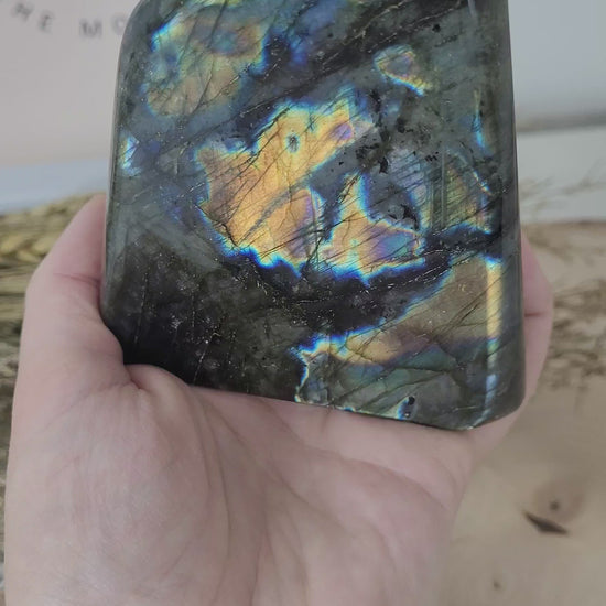 Die Labradorit Freiform hat eine Größe von 9,6 x 8 cm und wiegt 541g. Es handelt sich genau um die Labradorit Freiform, die auf den Bildern zu sehen ist.