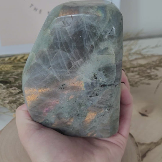 Der graue Labradorit bezaubert vor allem mit seinem Farbspektrum, welches in orange, violett und grün Farbtönen vorkommen kann bei Lichteinfall, die auch unter dem Namen Sunset Flash bekannt sind teils mit silbrigen Schimmer, teils mit kleinen Regenbögen bei Lichteinfall in der Gesteinsstruktur.