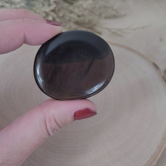Der Lamellen Obsidian Scheibenstein hat eine Größe zwischen 3,5-4,5cm.