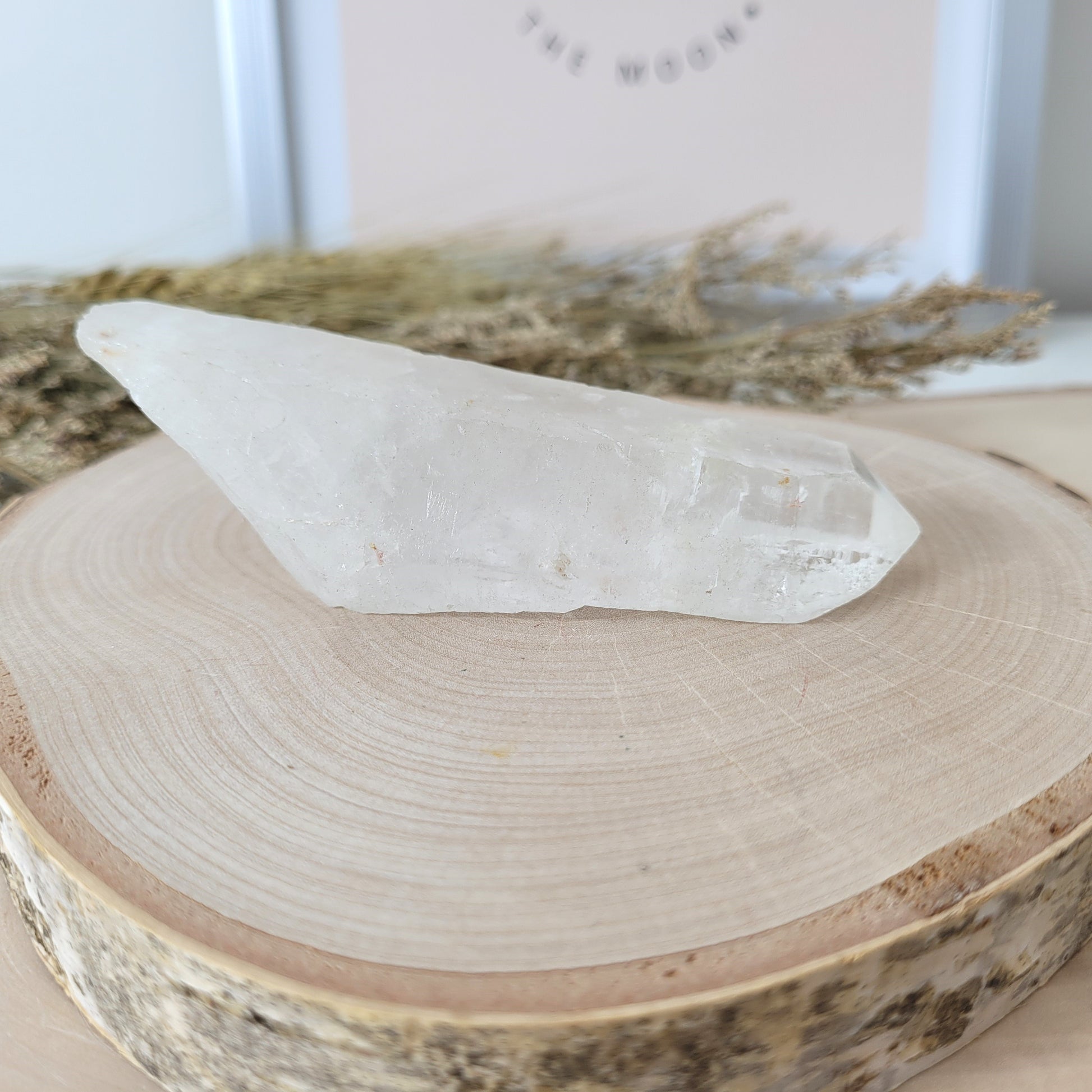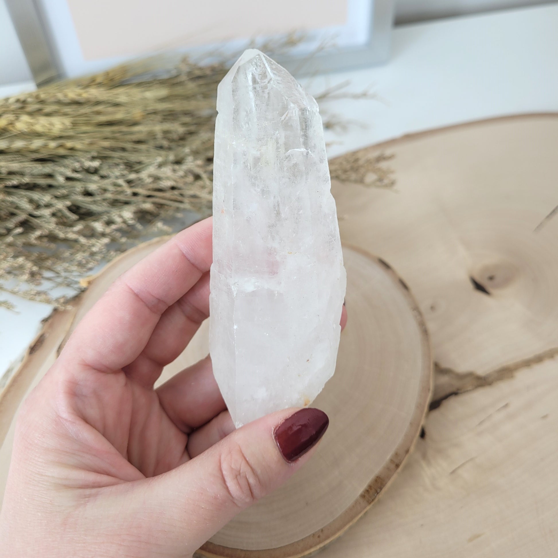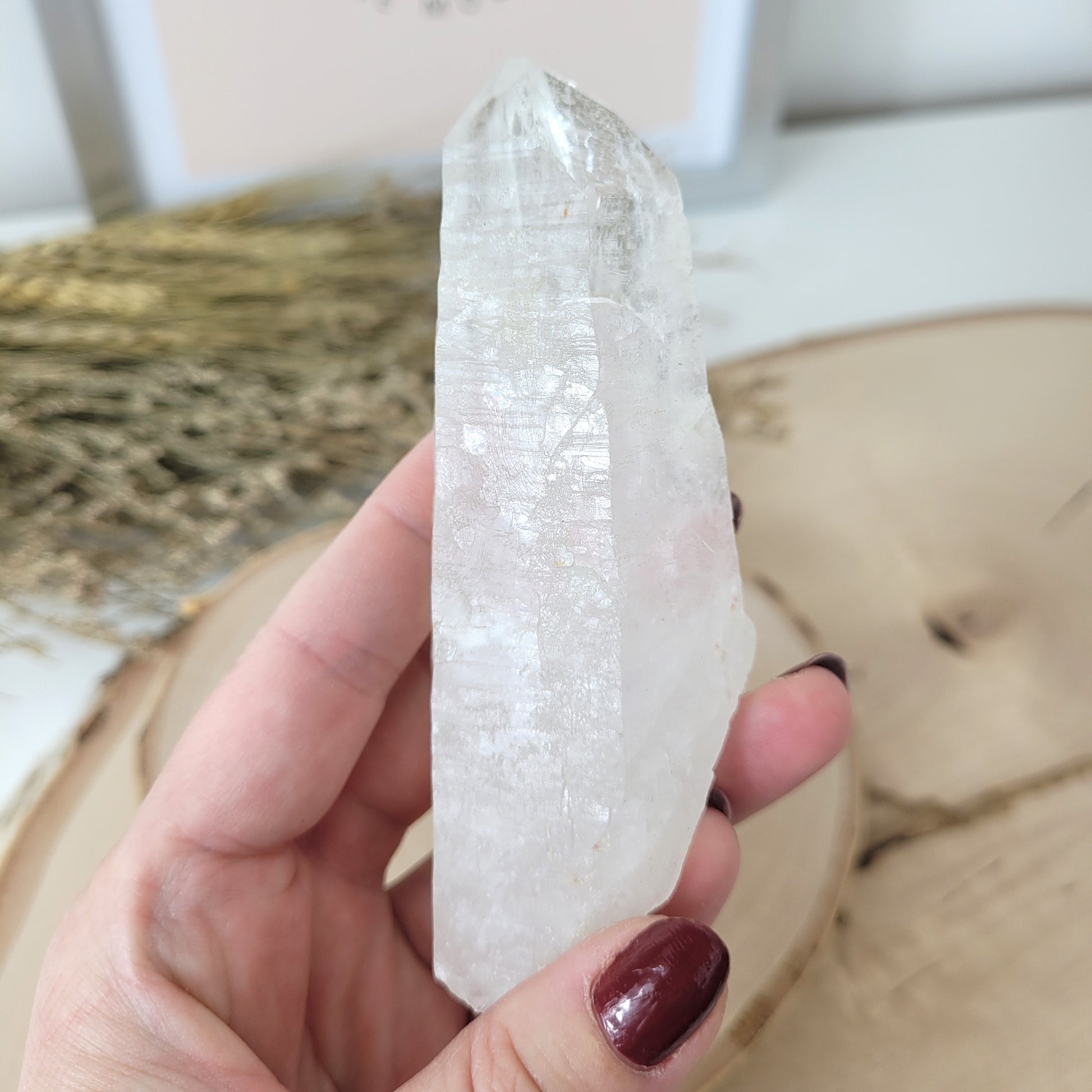 Die Lemurien Bergkristall Naturspitze hat eine Größe von 10 x 3,7 cm und wiegt 108g. Es handelt sich genau um die Naturspitze, die auf den Bildern zu sehen ist.