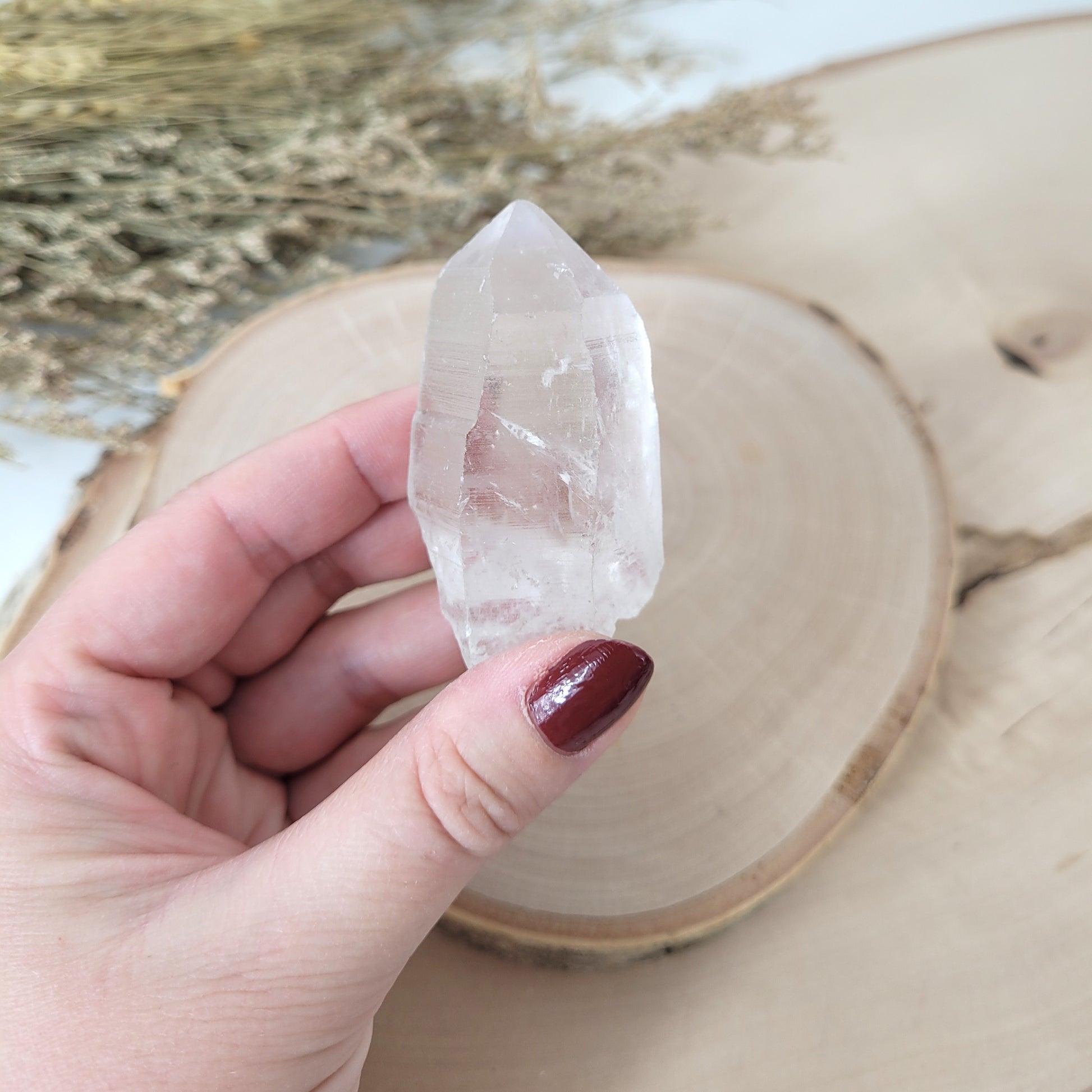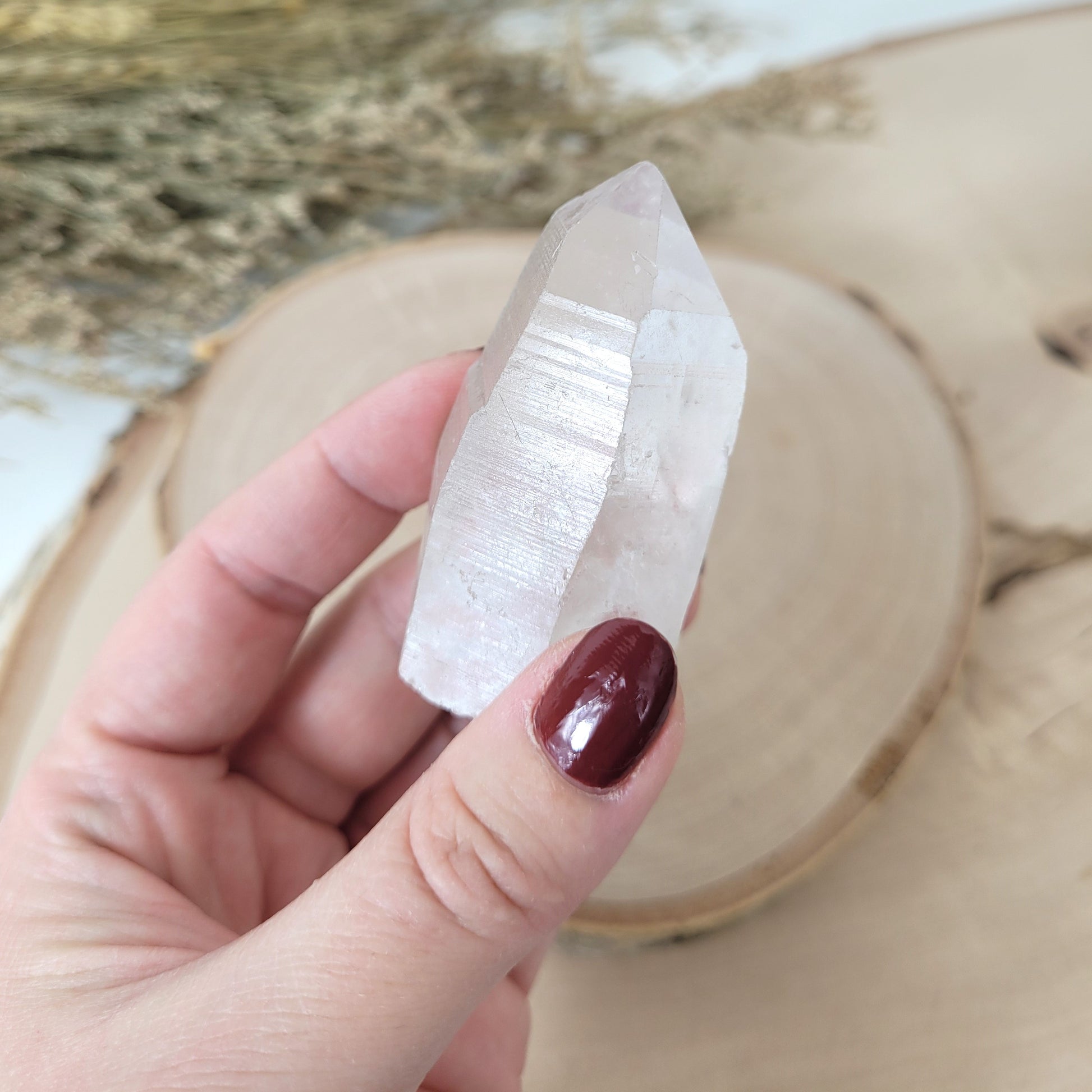 Die Lemurien Bergkristall Naturspitze hat eine Größe von 5,3 x 2,9 cm und wiegt 56g. Es handelt sich genau um die Naturspitze, die auf den Bildern zu sehen ist.