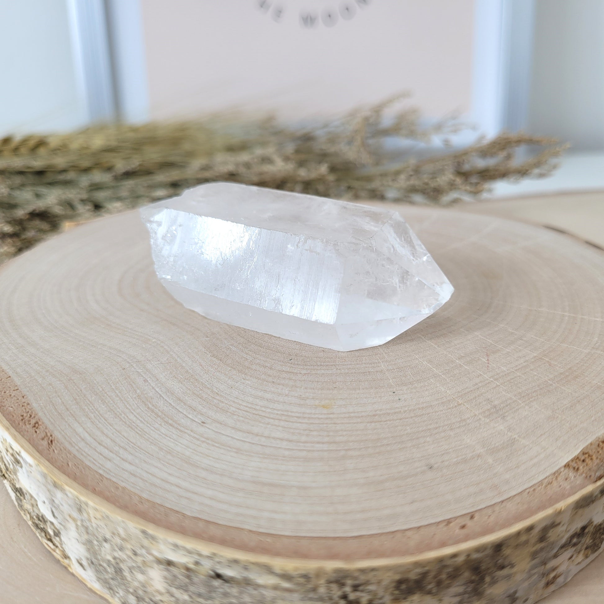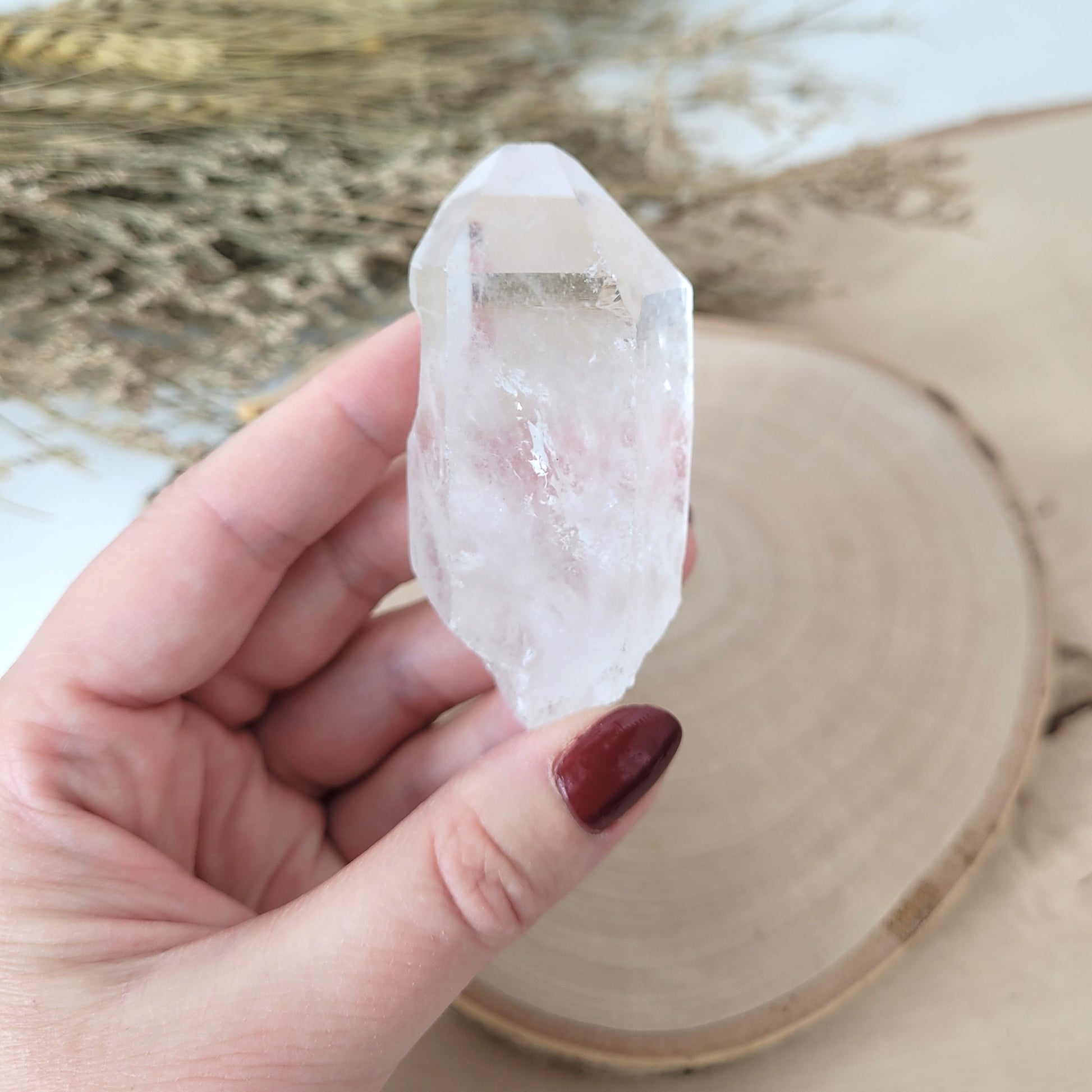 Die Lemurien Bergkristall Naturspitze hat eine Größe von 6,8 x 3,2 cm und wiegt 75g. Es handelt sich genau um die Naturspitze, die auf den Bildern zu sehen ist.
