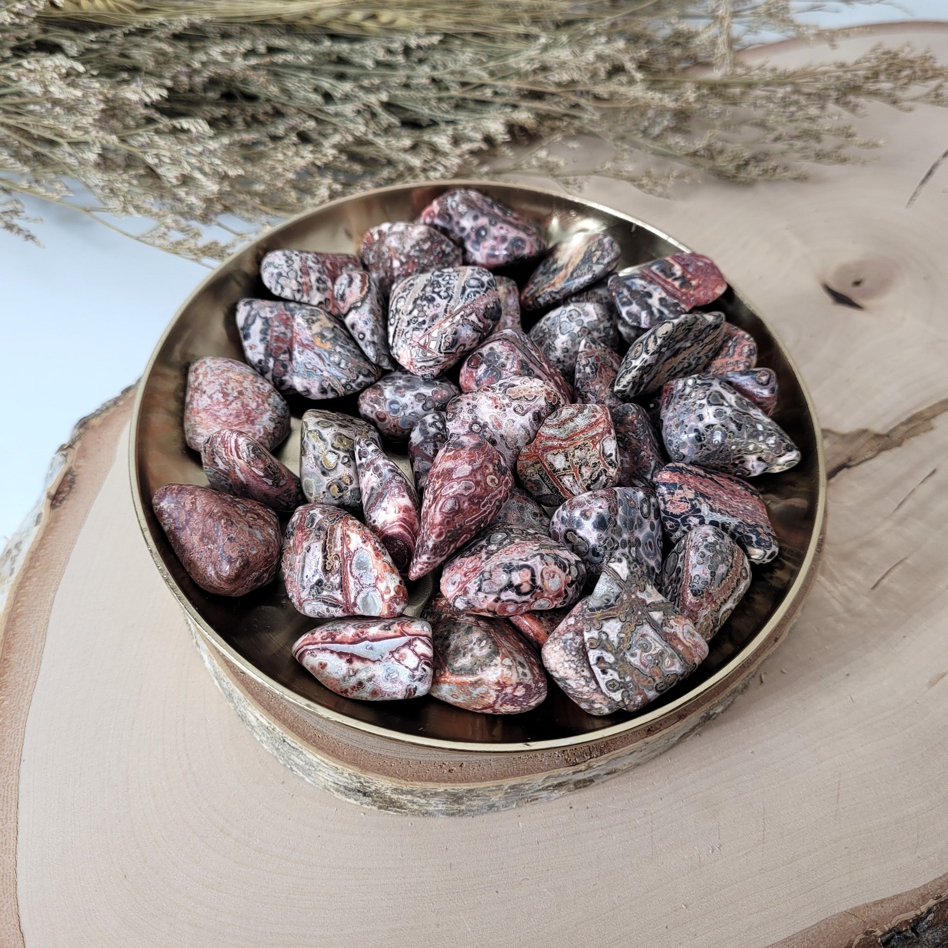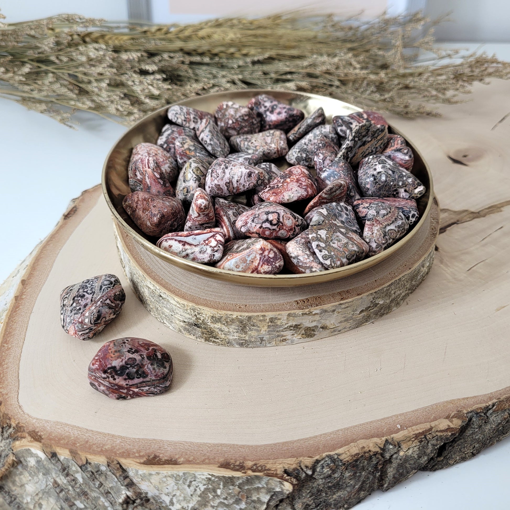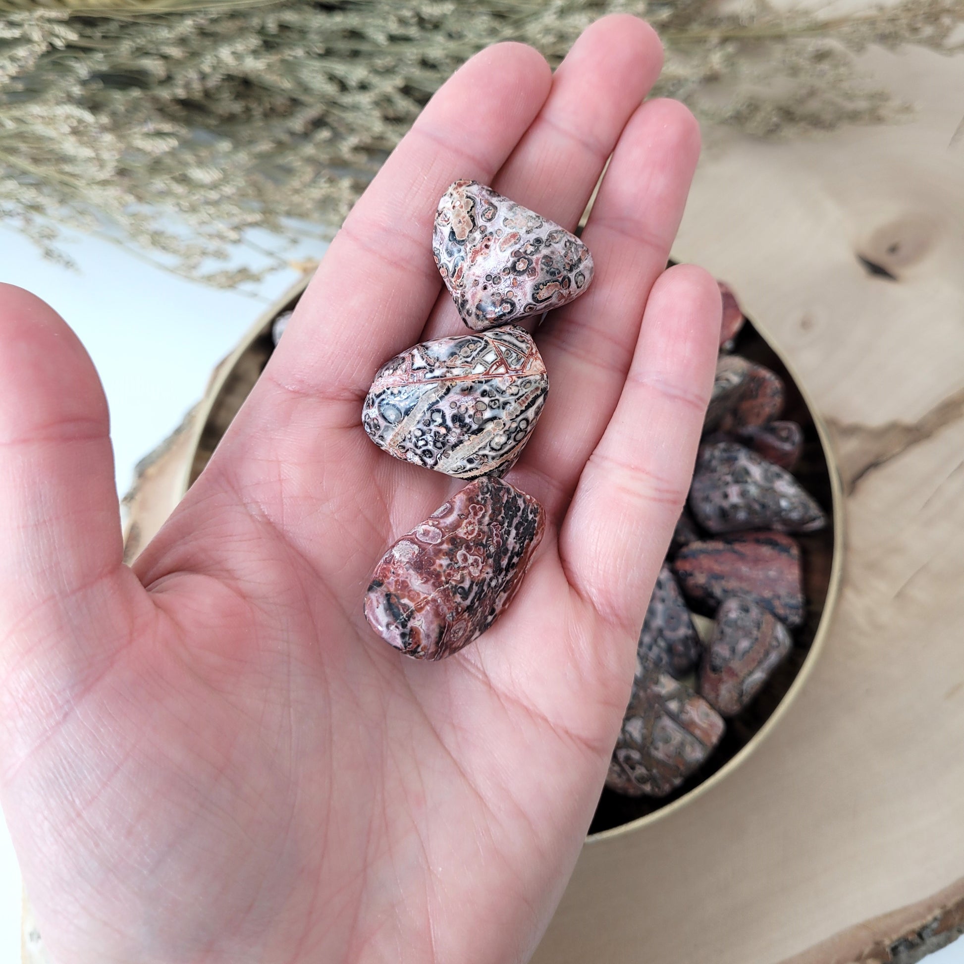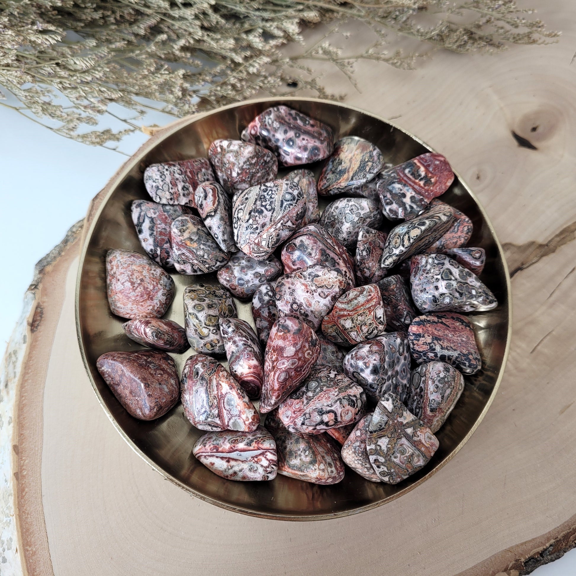 Der wunderschöne Leoparden Jaspis fasziniert mit seinen farbenfrohen "Fleckenmustern" über das gesamte Gestein, welche ihm seinen Namen verleihen. Leoparden Jaspis gehört zu der Gruppe der Rhyolithe und hat damit seinen vulkanischen Ursprung. Seine bunten sphärolithischen, also kugelförmigen Muster, entstehen durch Beimengen von Eisenoxiden im Quarz. Faszinierend ist das im Leoparden Jaspis auch ein hoher Anteil von Feldspat und Biotit vorhanden ist, daher als kleiner Tipp: den Trommelstein ganz nah betrachten, bei manchem Trommelstein kann sich auch das ein oder andere Glitzerplättchen zeigen. Die vulkanische Masse aus denen sich Rhyolithe bilden, erreicht die Erdoberfläche mit ca. 700 - 900 Grad Celcius, während der Abkühlung entstehen die faszinierenden Naturwunder. Jeder Leoparden Jaspis hat seine eigene ganz besondere Schönheit. Leoparden Jaspis hat ein Alter von rund 100 - 200 Millionen von Jahren.