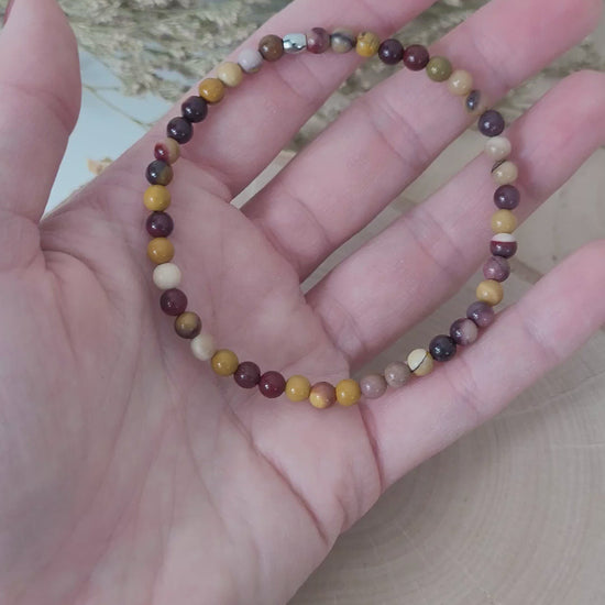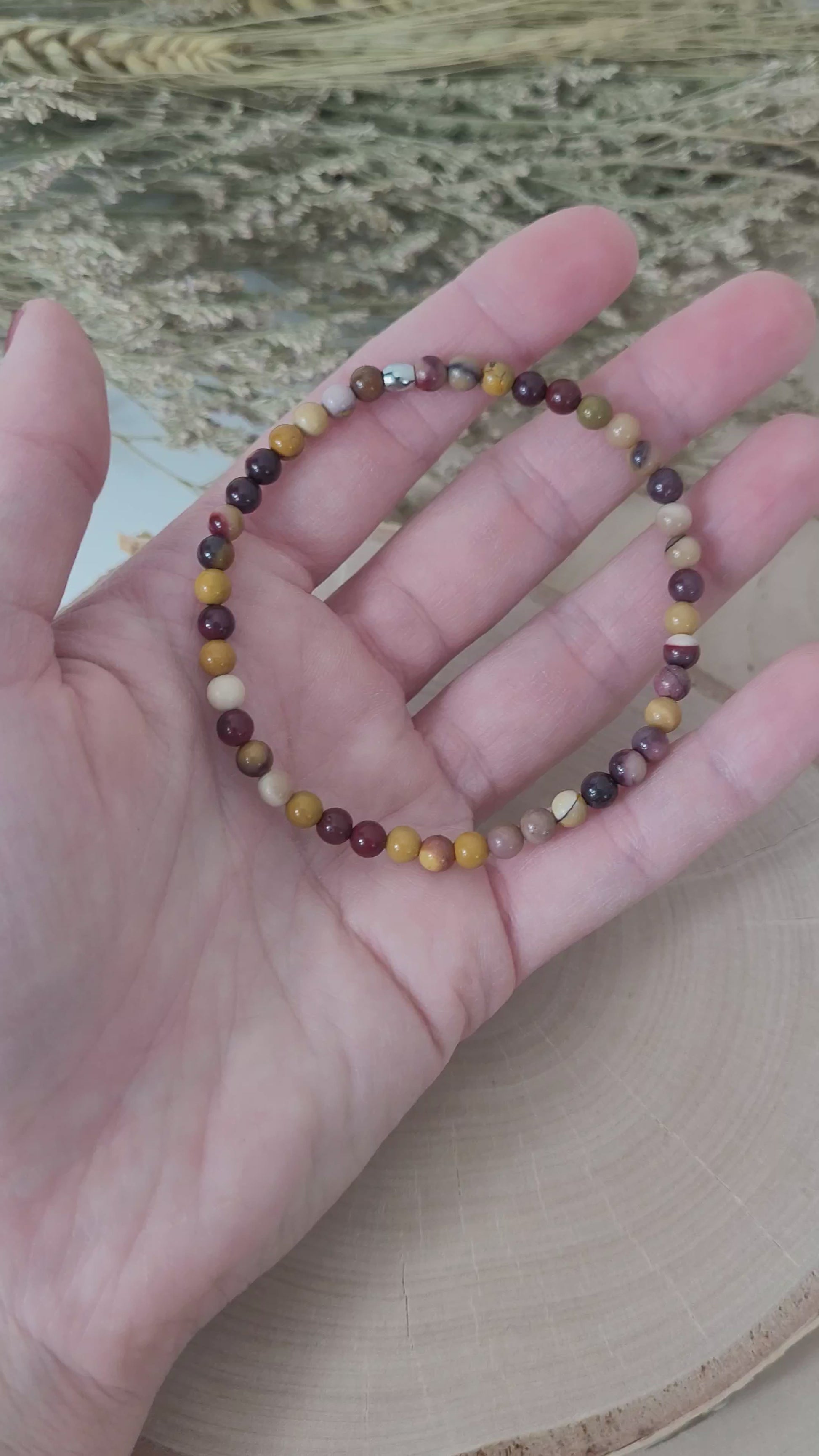 Elastisches Armband aus 4mm Mookait Perlen und einer Endperle (zum eleganten Kaschieren des Endknotens) aus hochwertigem Edelstahl (rostfrei, wasserfest). Armbandlänge ca. 19 cm.