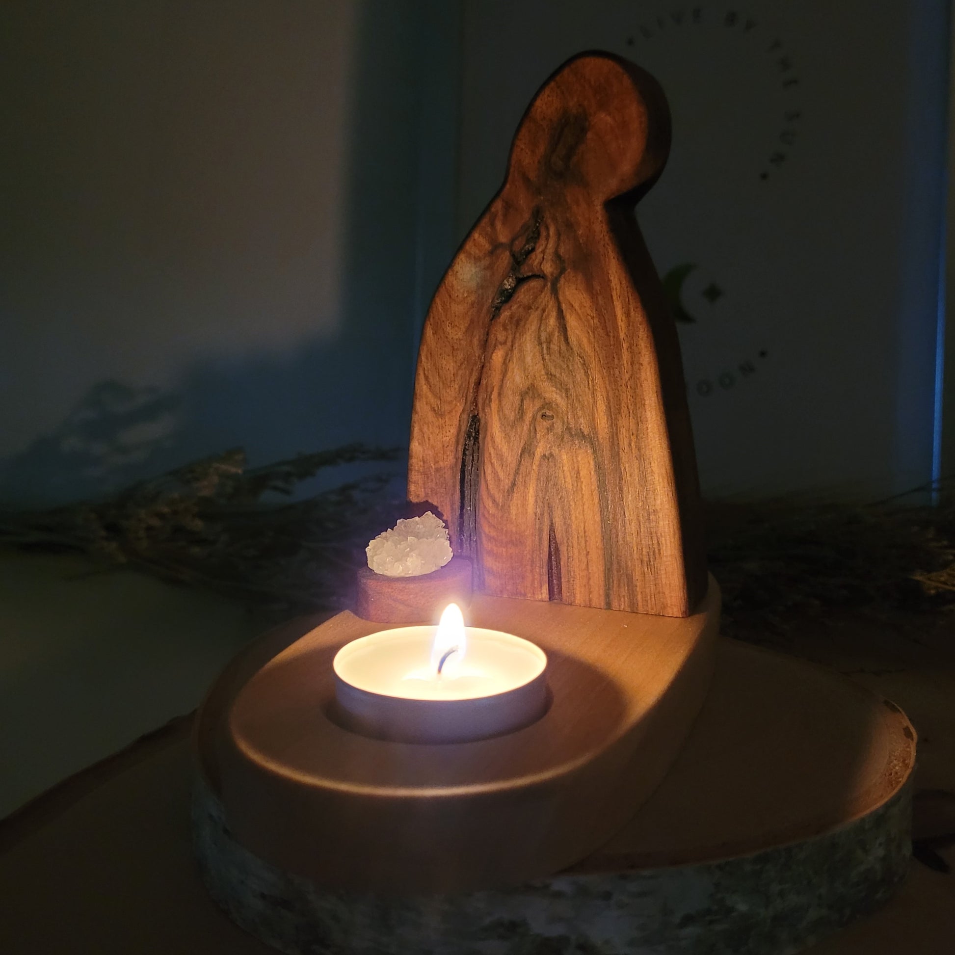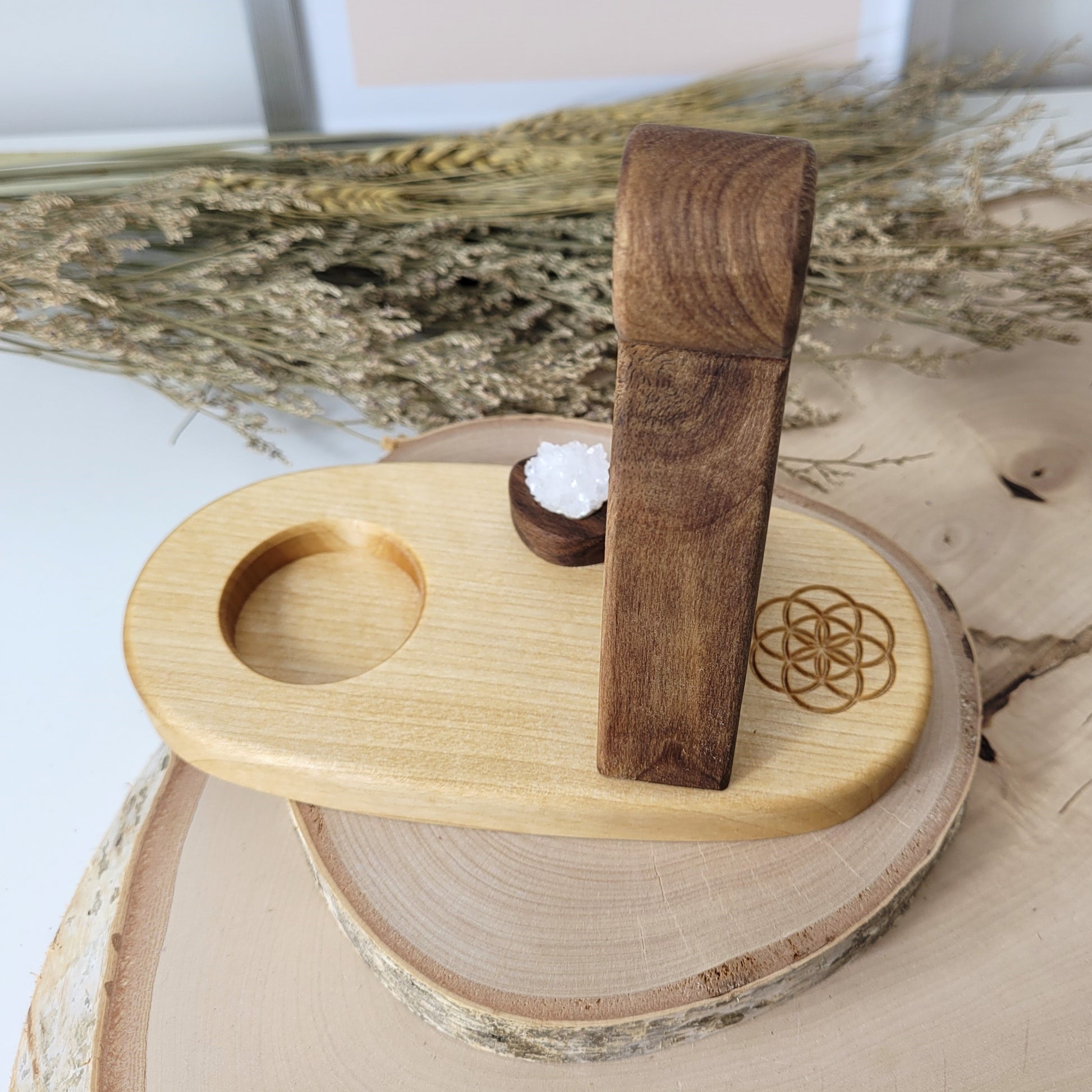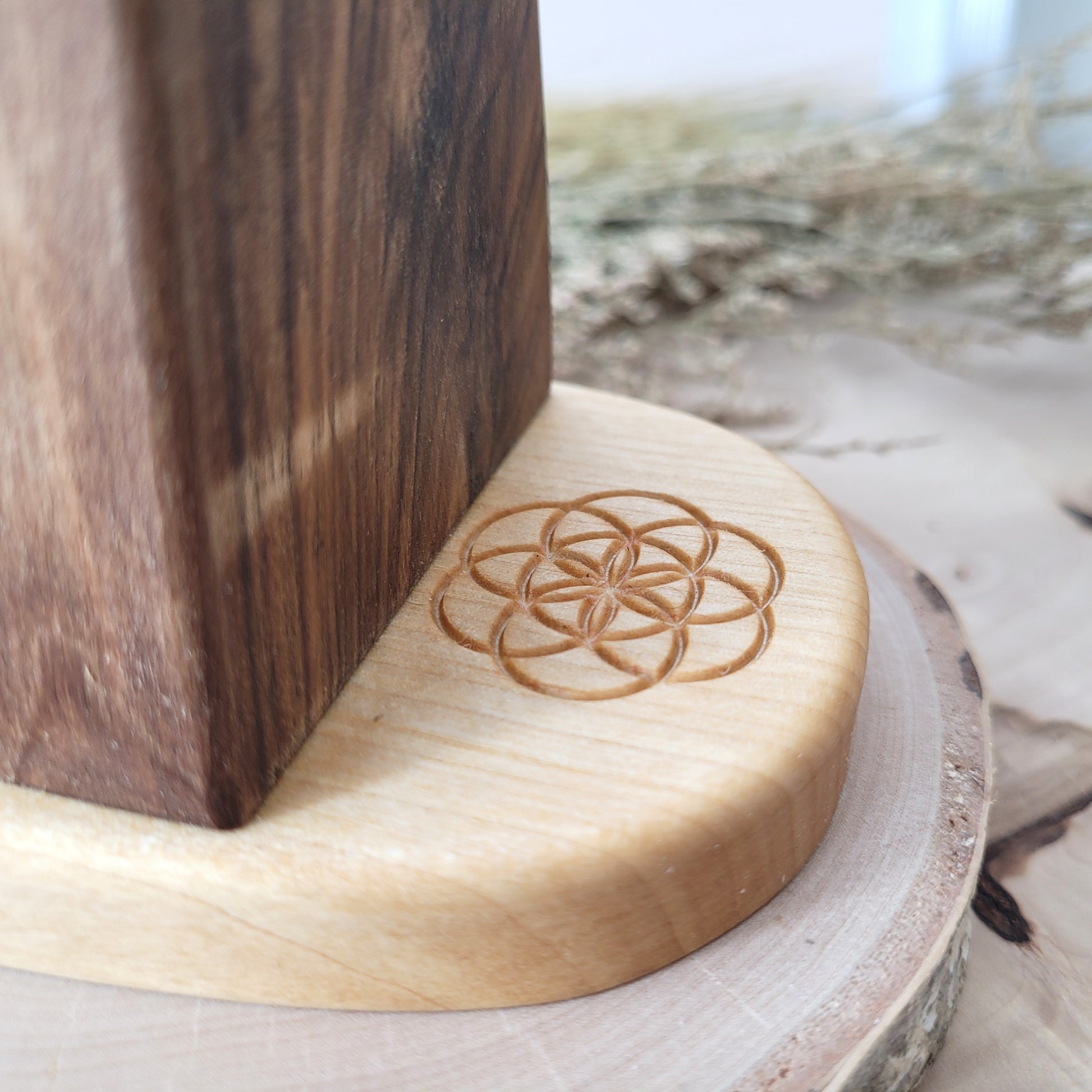 Nussholz "Engelslicht" Teelichthalter mit Samen des Lebens Gravur und Bergkristall Geode