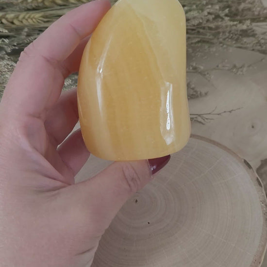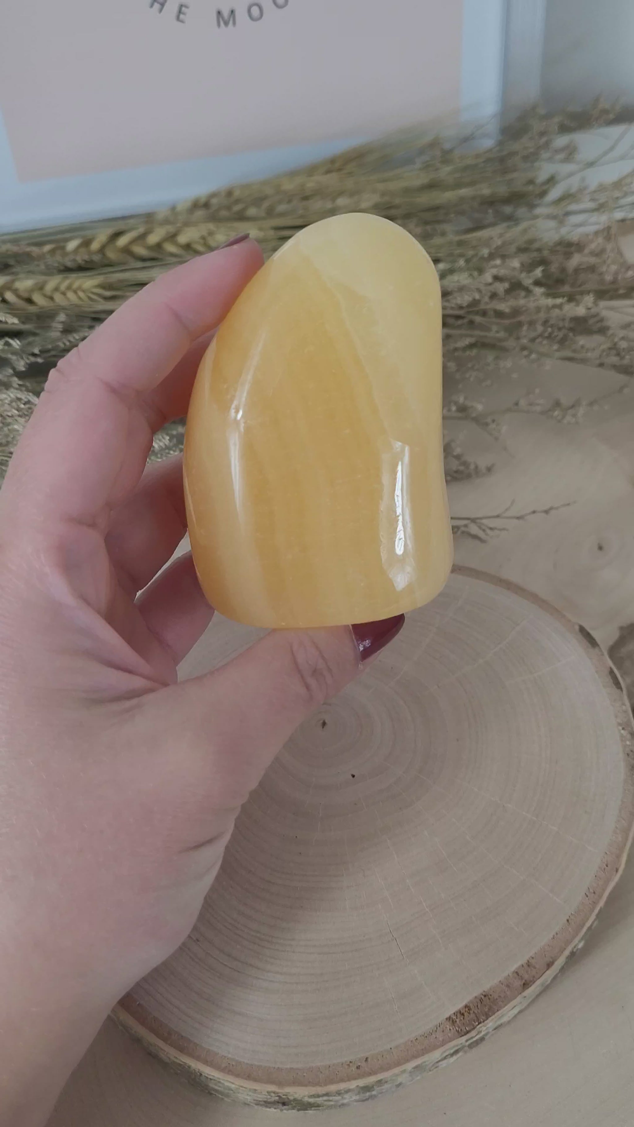 Die Orangencalcit Freiform hat eine Größe von 7,3x5,2cm und wiegt 231g. Es handelt sich genau um die Orangencalcit Freiform, die auf den Bildern zu sehen ist.
