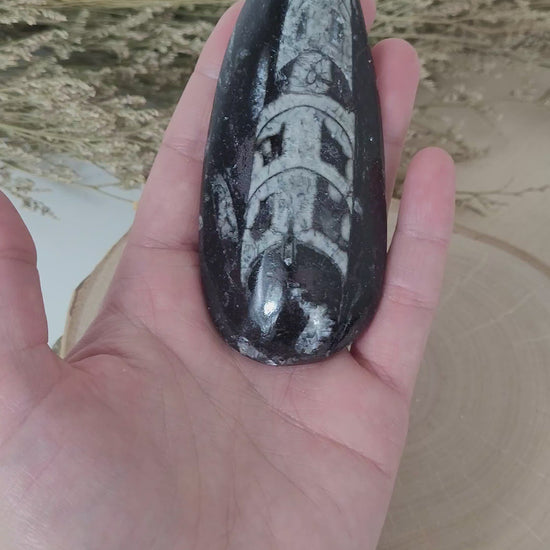 Diese Spitze ist so geschliffenen, dass die Orthoceraten Fossilien dabei in ihrer ganzen Schönheit erstrahlen dürfen. Die Spitze ist liegend und nur auf der Vorderseite poliert.