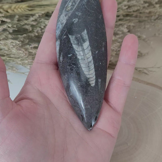Diese Spitze ist so geschliffenen, dass die Orthoceraten Fossilien dabei in ihrer ganzen Schönheit erstrahlen dürfen. Die Spitze ist liegend und nur auf der Vorderseite poliert.