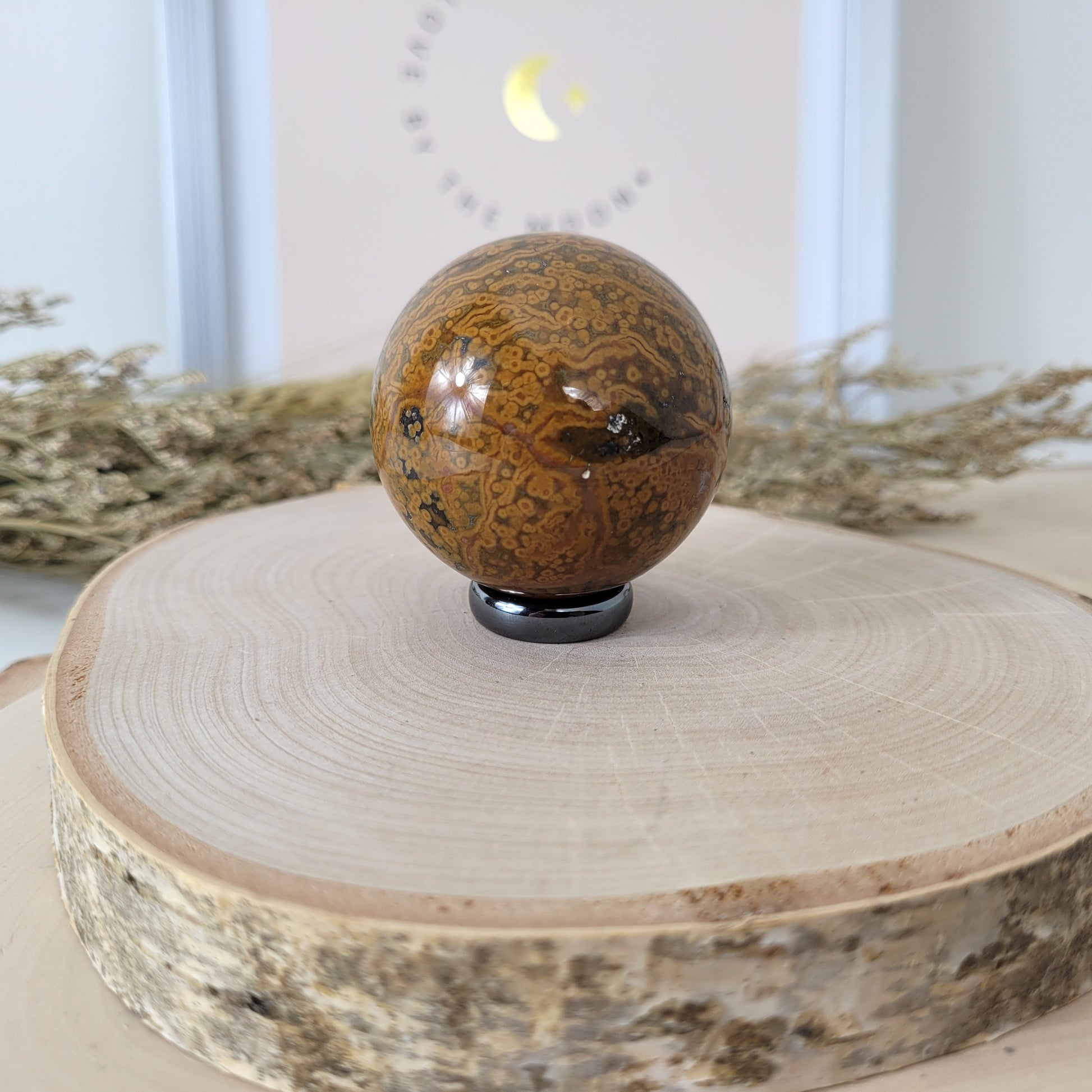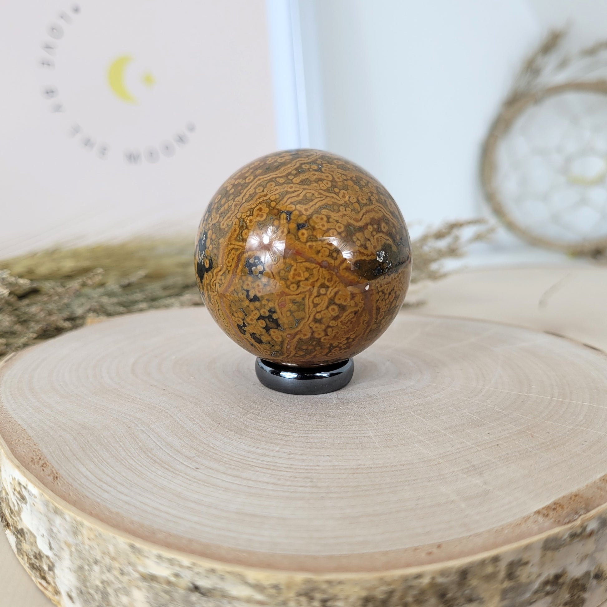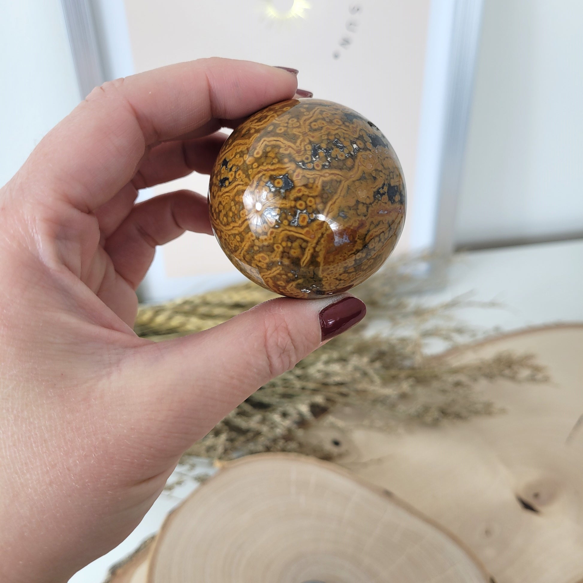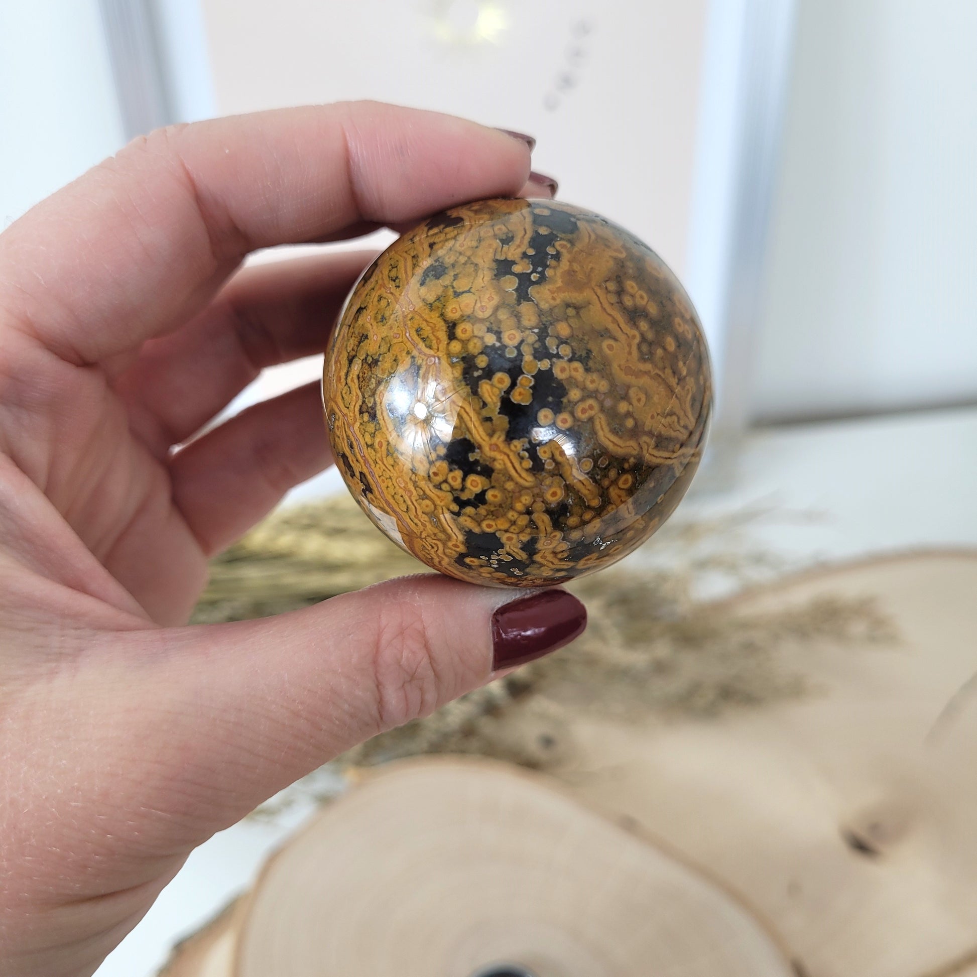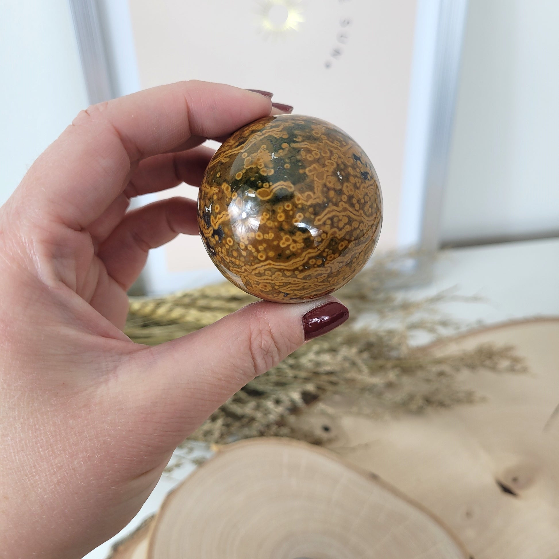 Diese Ozean Jaspis Kugel hat einen Durchmesser von 4,7cm und wiegt 154g. Es handelt sich genau um die Ozean Jaspis Kugel, die auf den Bildern zu sehen ist.