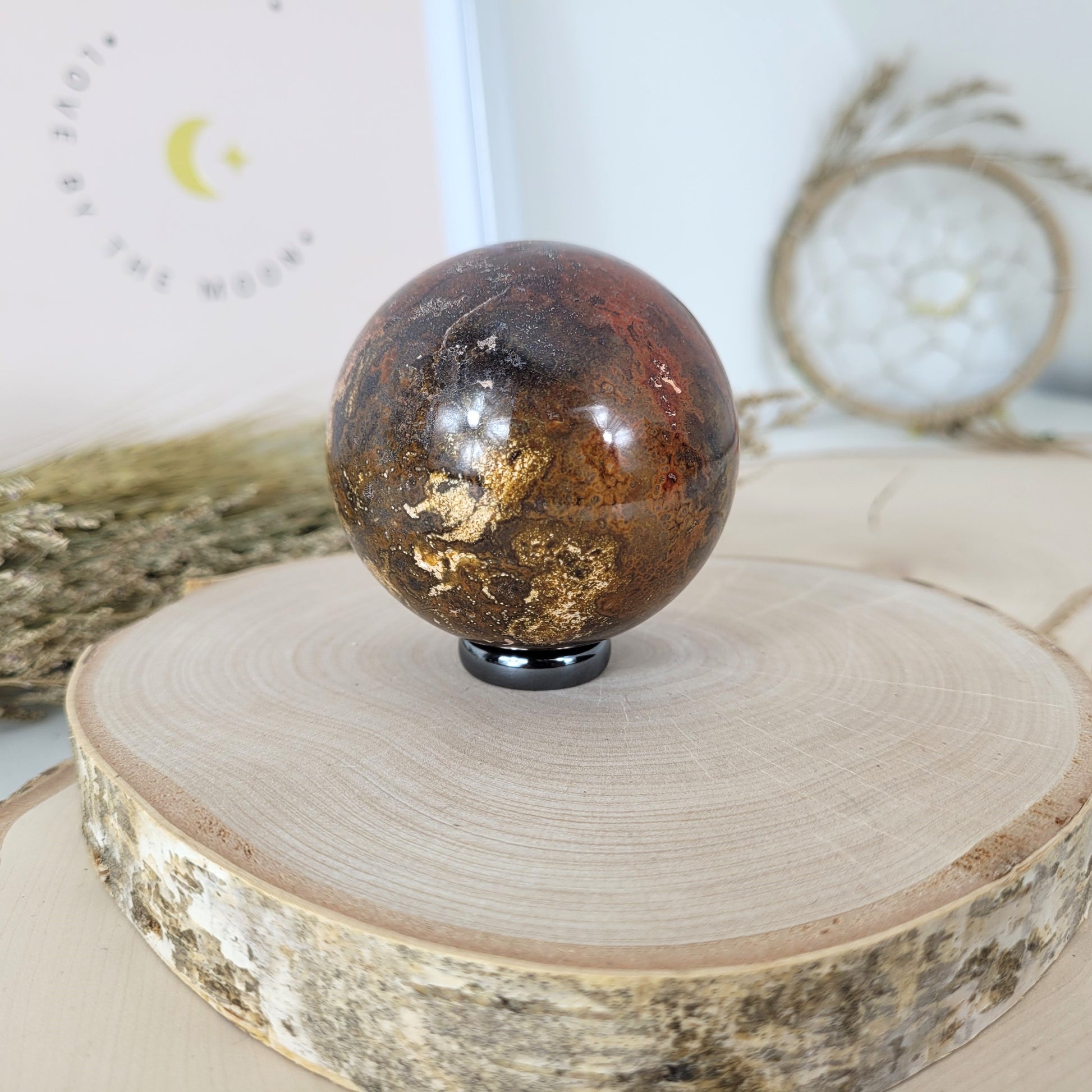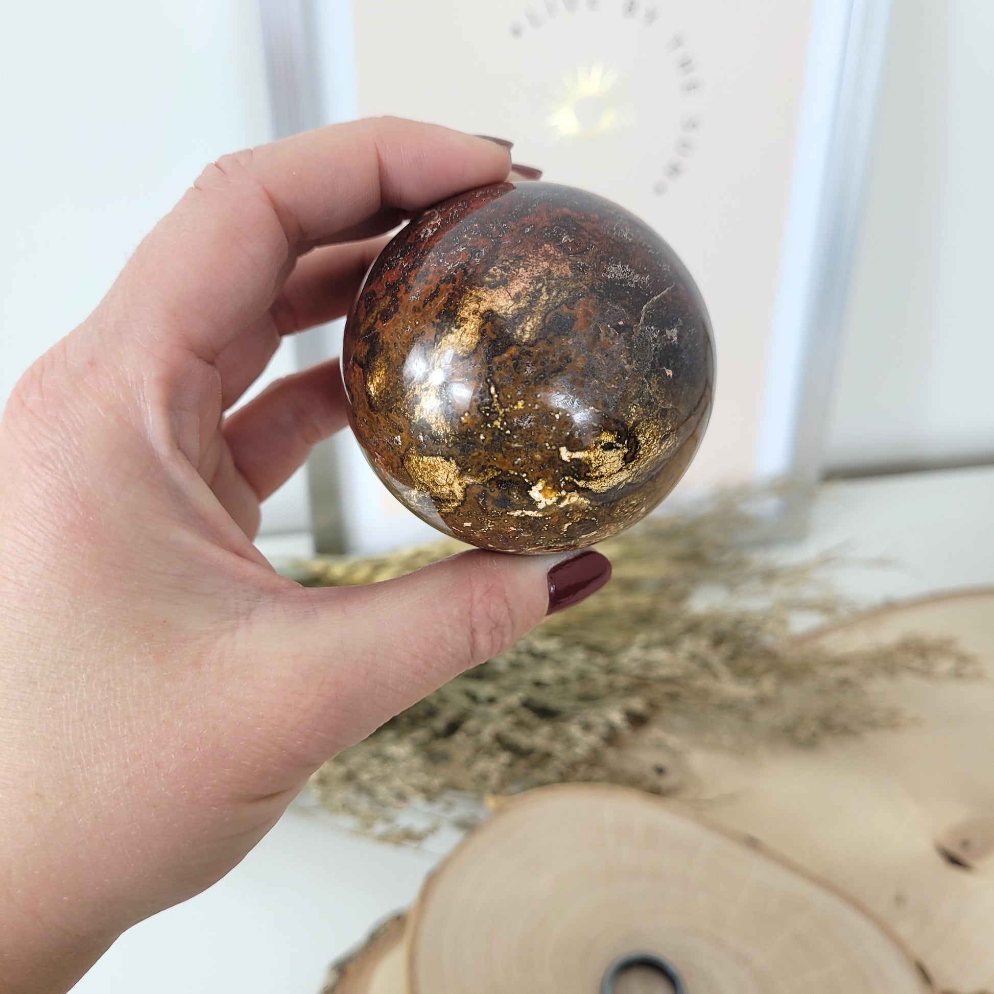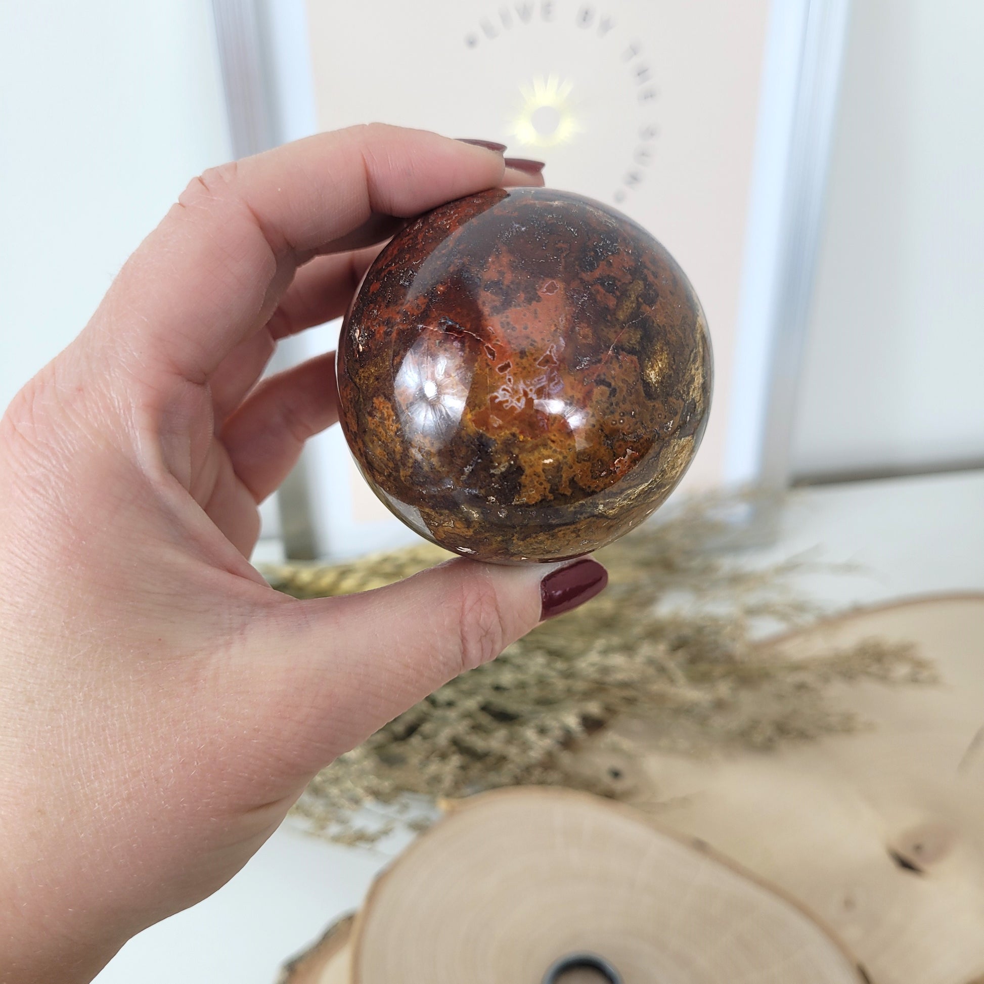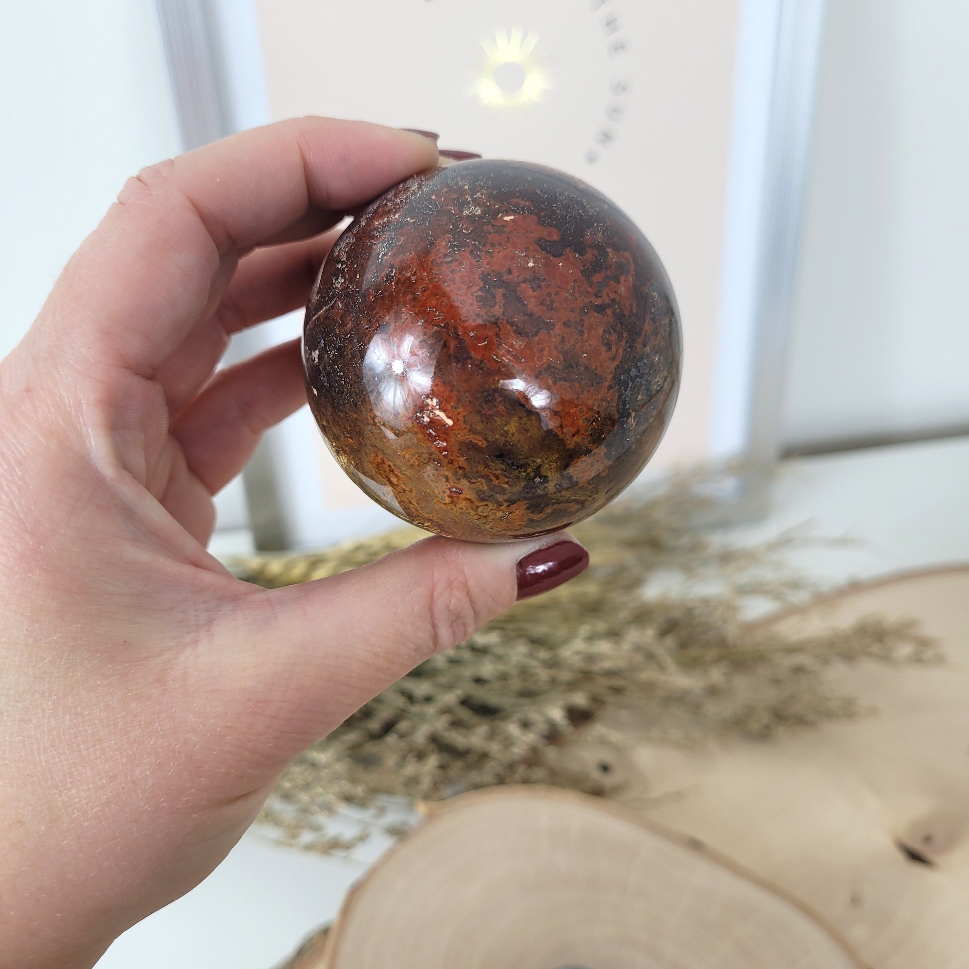 Diese Ozean Jaspis Kugel hat einen Durchmesser von 5,9cm und wiegt 301g. Es handelt sich genau um die Ozean Jaspis Kugel, die auf den Bildern zu sehen ist.