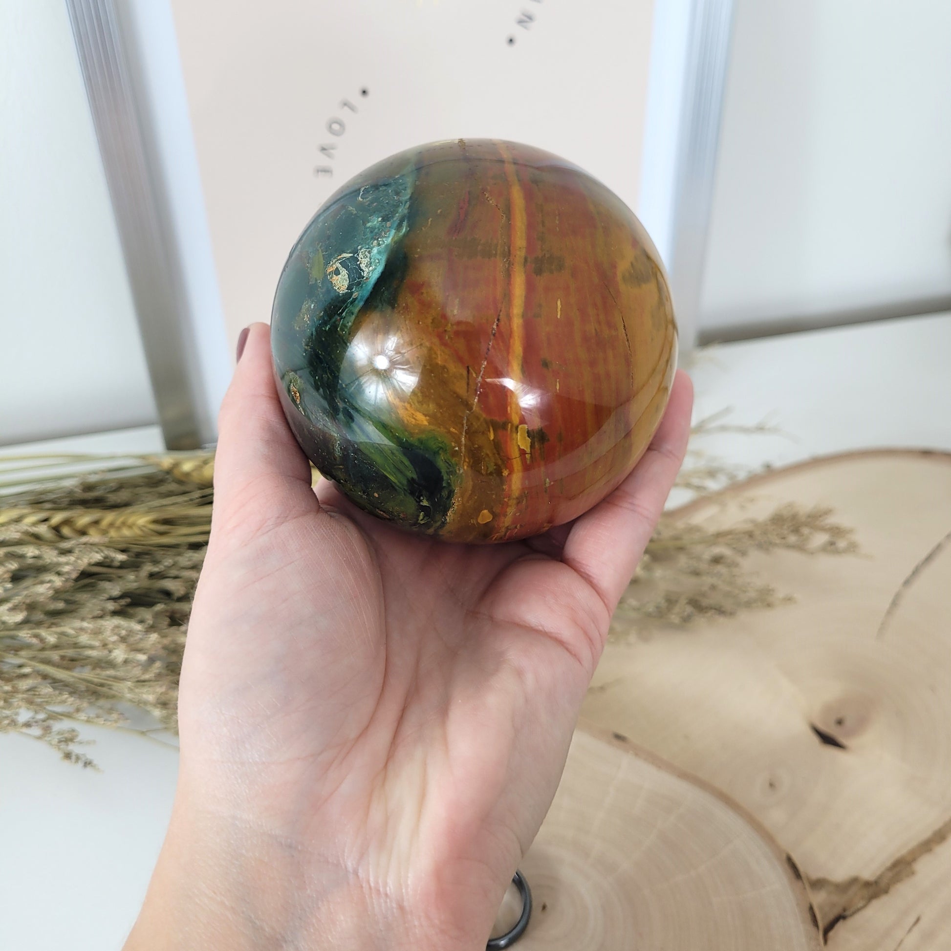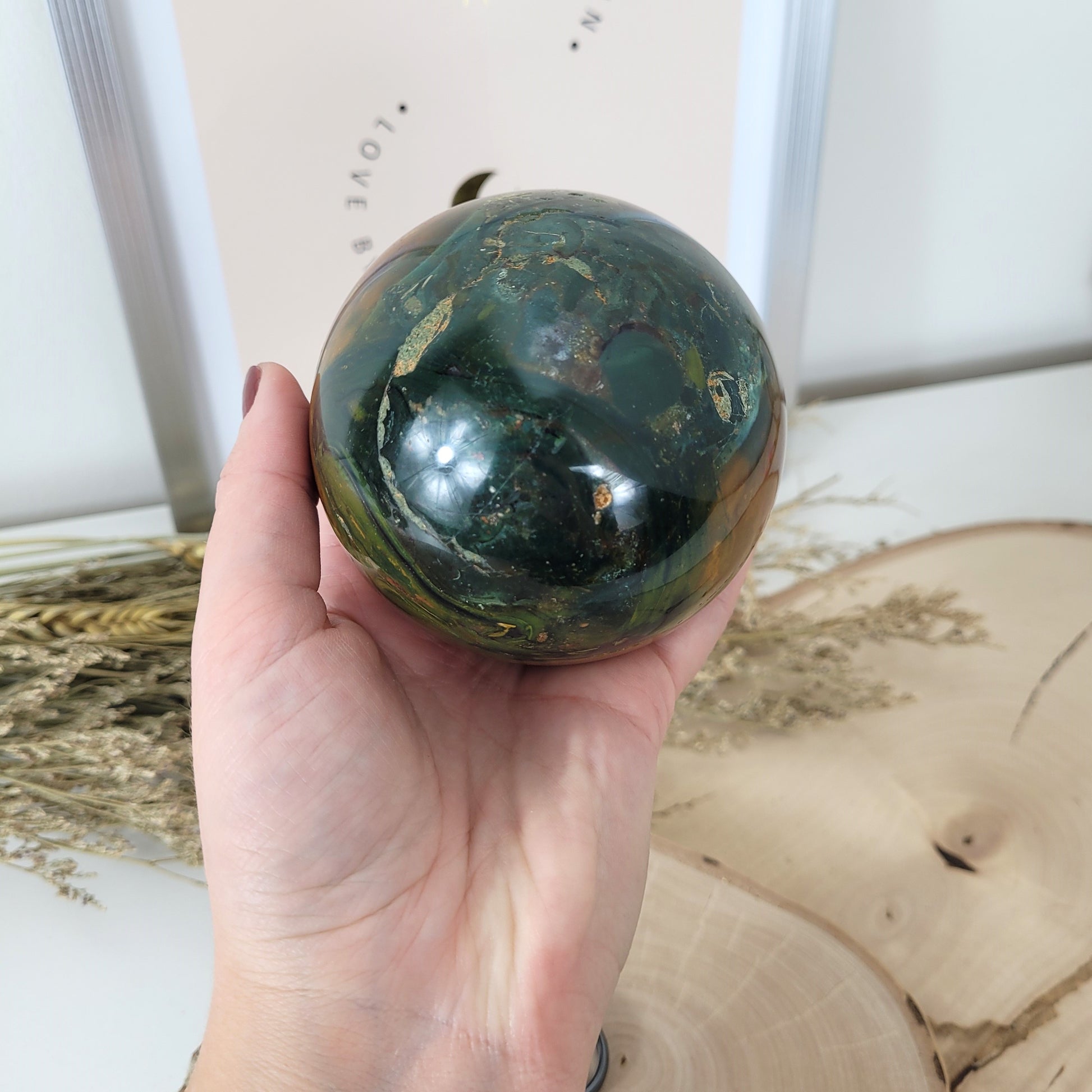 Diese Ozean Jaspis Kugel hat einen Durchmesser von 8,3cm und wiegt 802g. Es handelt sich genau um die Ozean Jaspis Kugel, die auf den Bildern zu sehen ist.