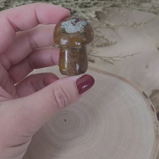 Dieser Ozean Jaspis Mini Pilz hat eine Größe von 3,6x2,7cm. Es handelt sich genau um den Ozean Jaspis Pilz, der auf den Bildern zu sehen ist.