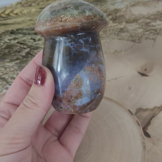 Dieser Ozean Jaspis Pilz hat eine Größe von 8x5,2cm und wiegt 297g. Es handelt sich genau um den Ozean Jaspis Pilz, der auf den Bildern zu sehen ist.