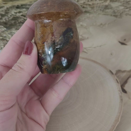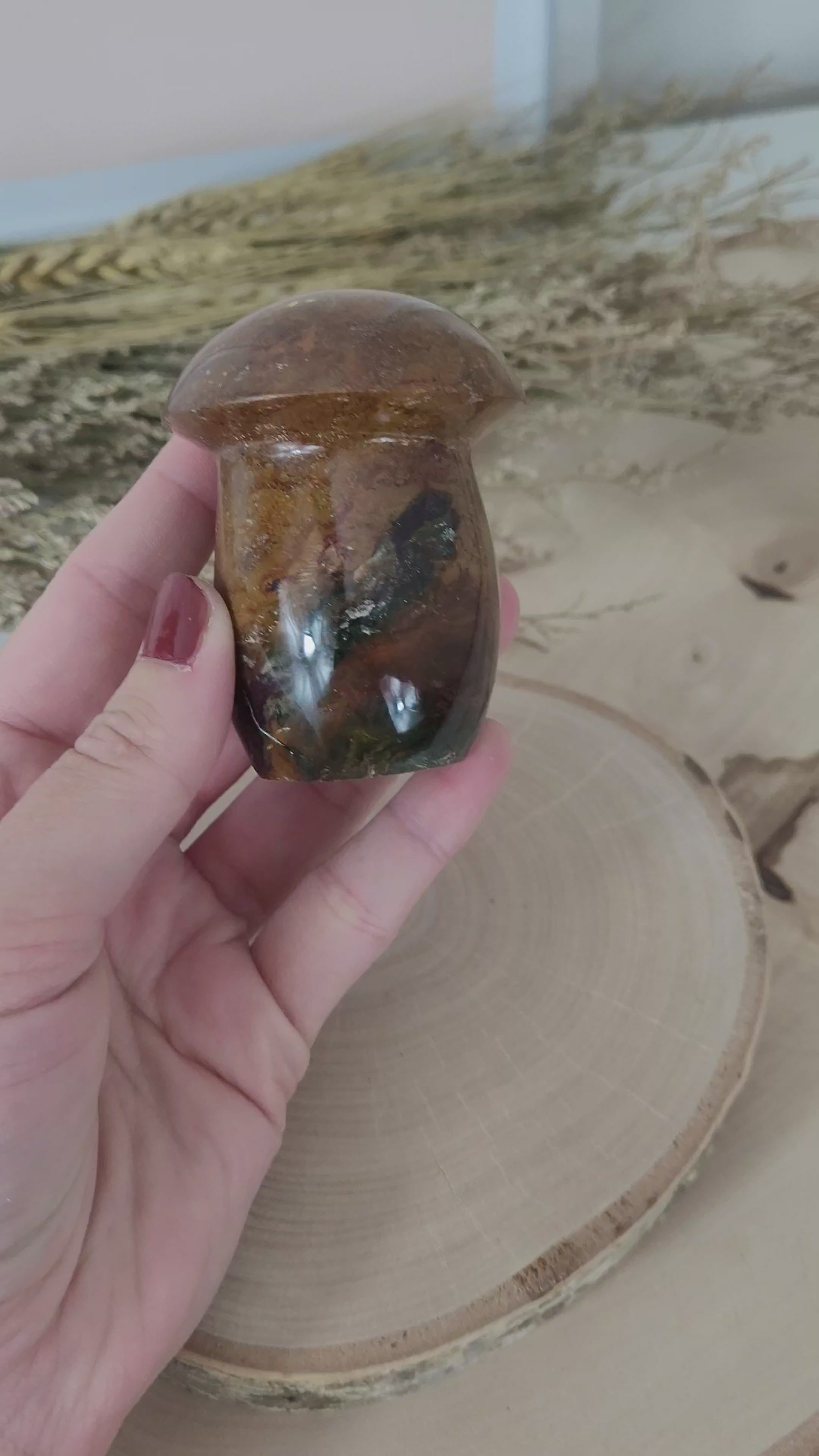 Dieser Ozean Jaspis Pilz hat eine Größe von 6,8x5cm und wiegt 217g. Es handelt sich genau um den Ozean Jaspis Pilz, der auf den Bildern zu sehen ist.