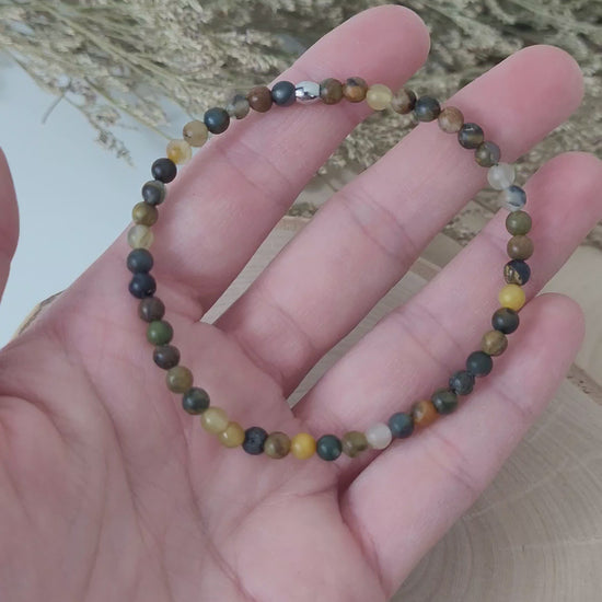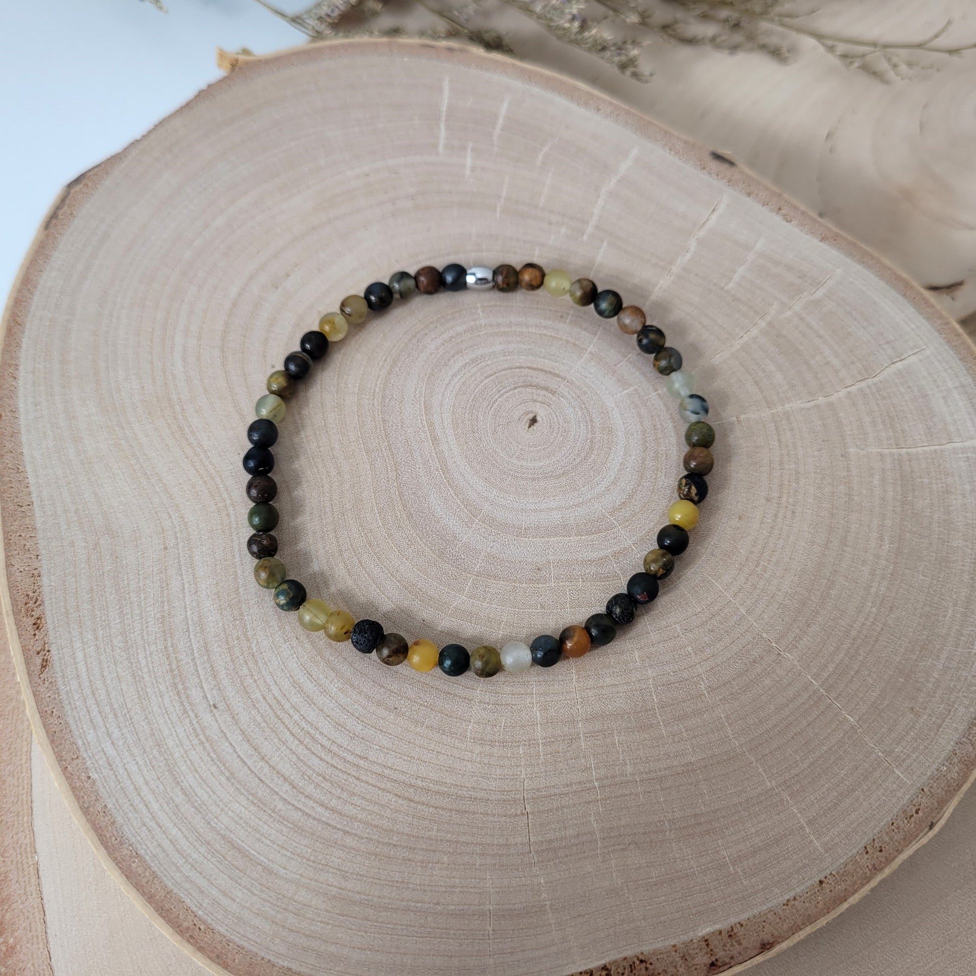 Elastisches Armband aus 4 mm Pietersit Perlen und einer Endperle (zum eleganten Kaschieren des Endknotens) aus hochwertigem Edelstahl (rostfrei, wasserfest). Armbandlänge ca. 19 cm.