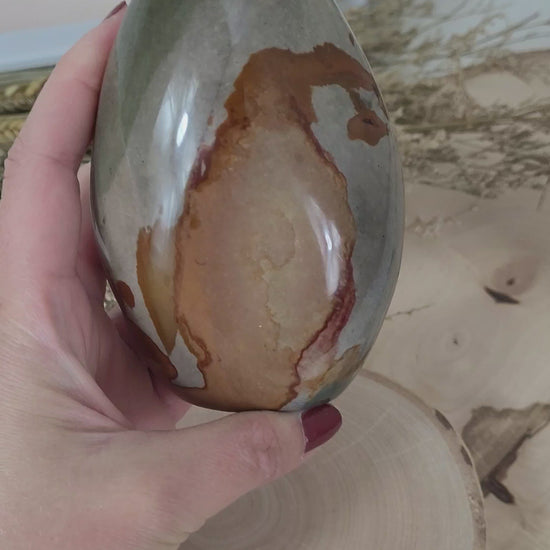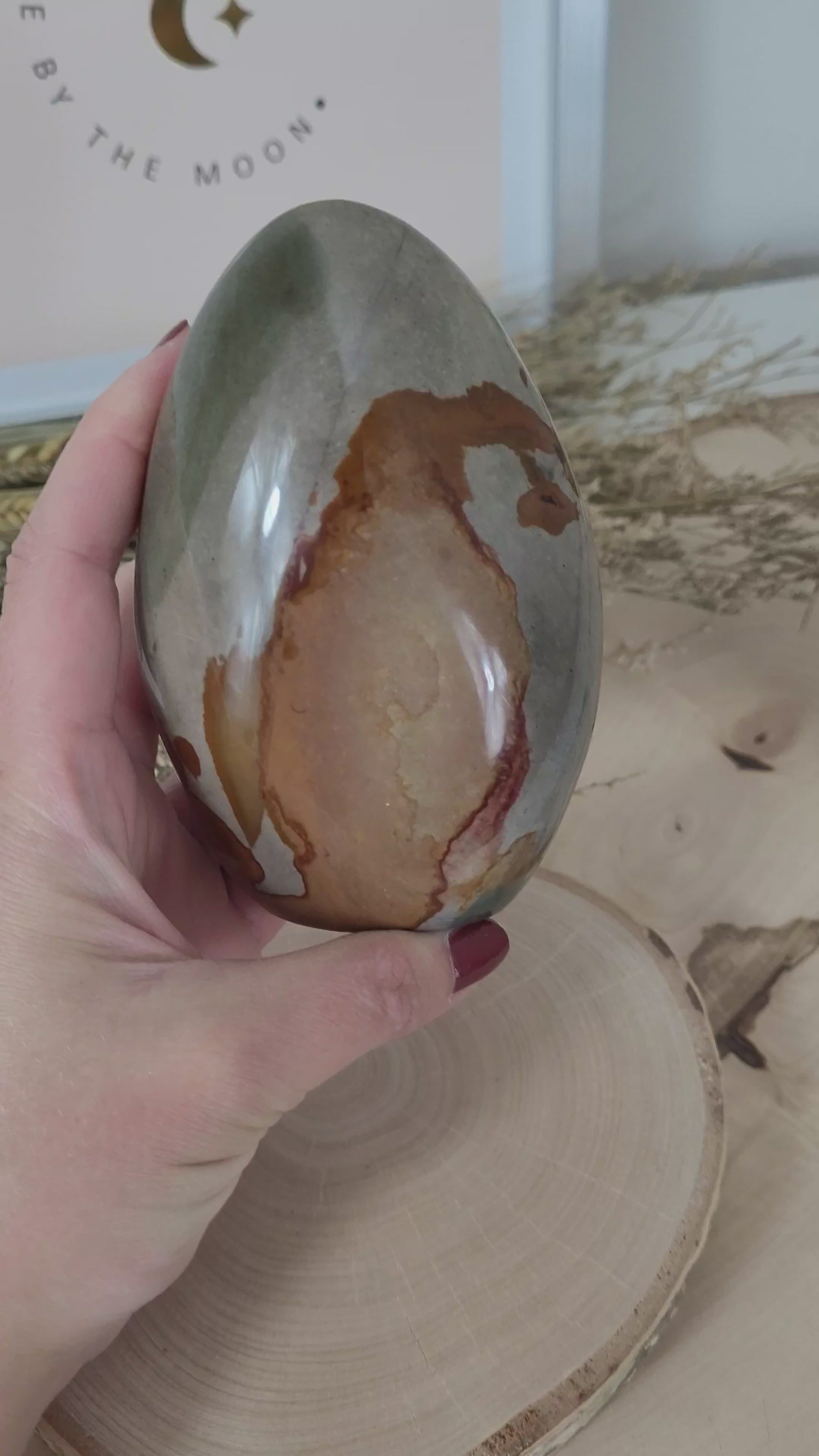 Diese Polychrom Jaspis Freiform hat eine Größe von 11x7,3cm und wiegt 491g. Es handelt sich genau um die Freiform, die auf den Bildern zu sehen ist.