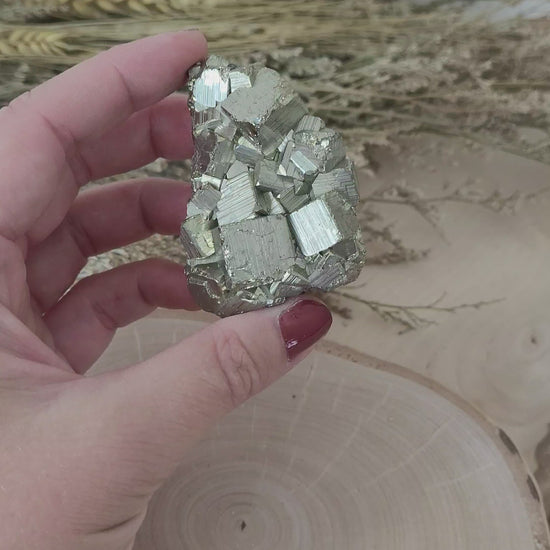 Diese Pyrit Kristallstufe fasziniert mit ihrer ausgeprägten Kristallbildung und klar erkennbaren Einzelkristallen zu einer Stufe ineinander verwachsen, teils mit ihren Würfelkristallen und teils mit wunderschöner Rillenbildung in den einzelnen Kristallen. Die Rohkristallstufe ist rundum natürlich gewachsen und naturbelassen.