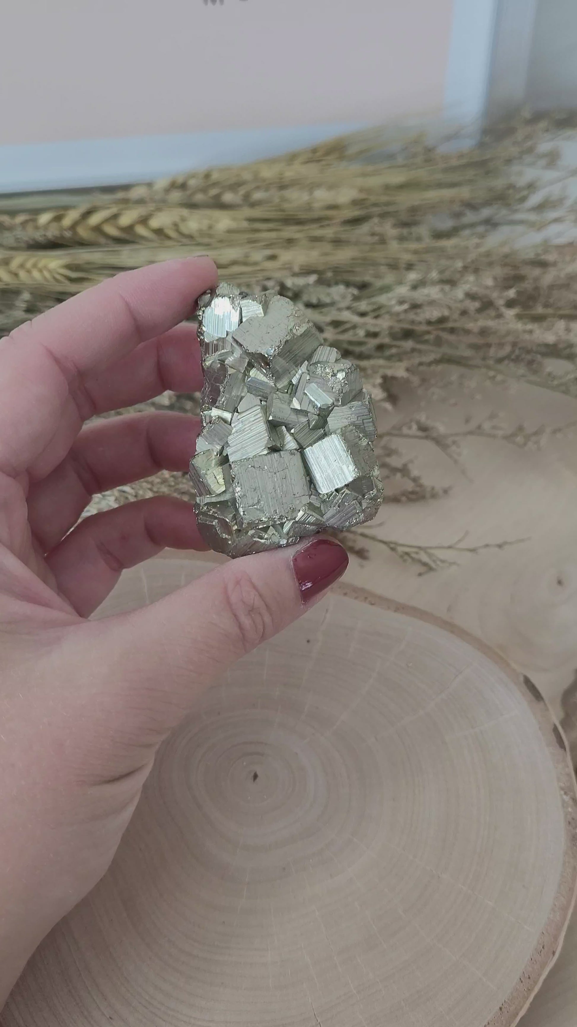 Die Pyrit Kristallstufe hat eine Größe von 5,3 x 3,6 cm und wiegt 106g. Es handelt sich genau um die Pyrit Kristallstufe, die auf den Bildern zu sehen ist.