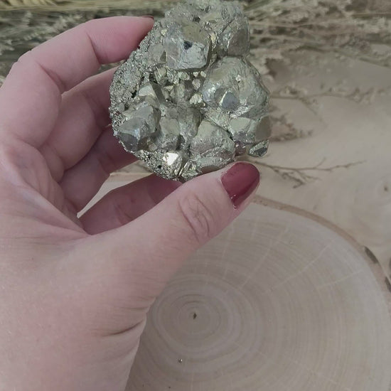 Die Pyrit Kristallstufe hat eine Größe von 5,8 x 4,9 cm und wiegt 142g. Es handelt sich genau um die Pyrit Kristallstufe, die auf den Bildern zu sehen ist.