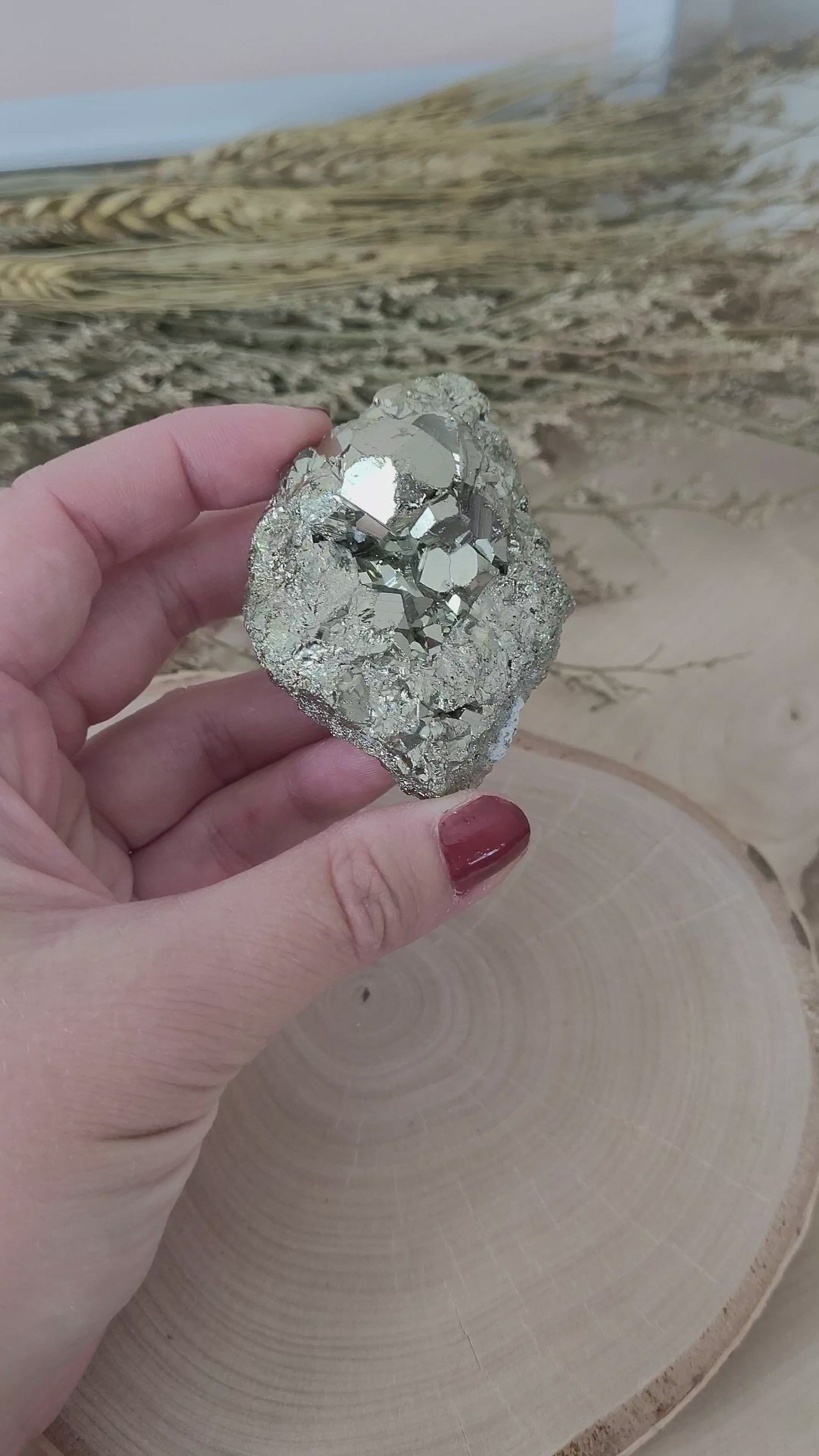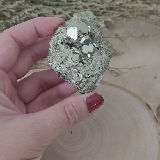 Die Pyrit Kristallstufe hat eine Größe von 6,2 x 4,3 cm und wiegt 111g. Es handelt sich genau um die Pyrit Kristallstufe, die auf den Bildern zu sehen ist.