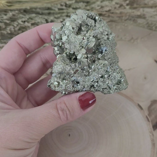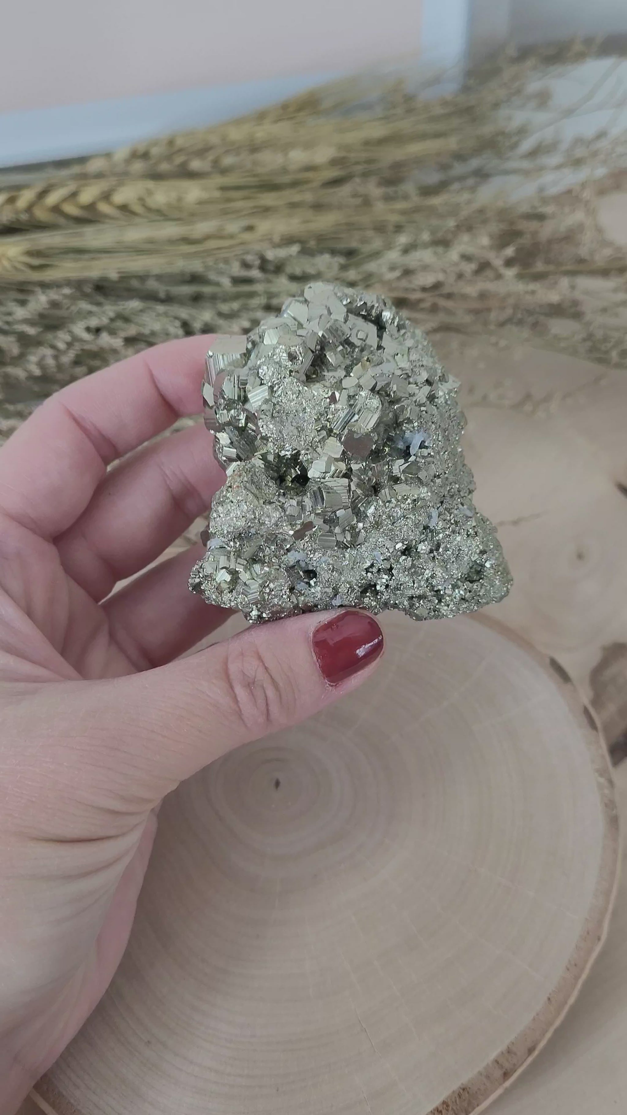 Die Pyrit Kristallstufe hat eine Größe von 6,3 x 5,1 cm und wiegt 239g. Es handelt sich genau um die Pyrit Kristallstufe, die auf den Bildern zu sehen ist.