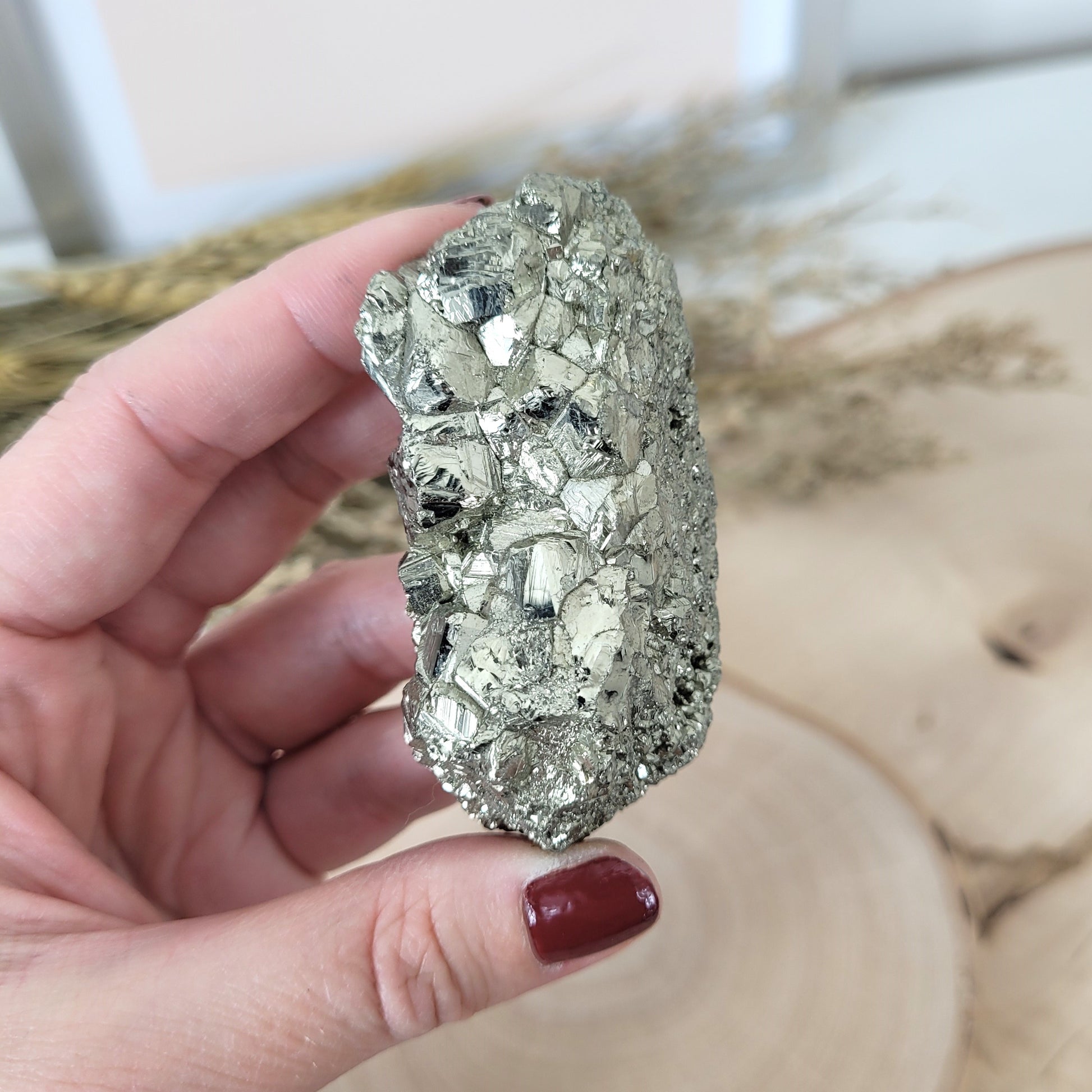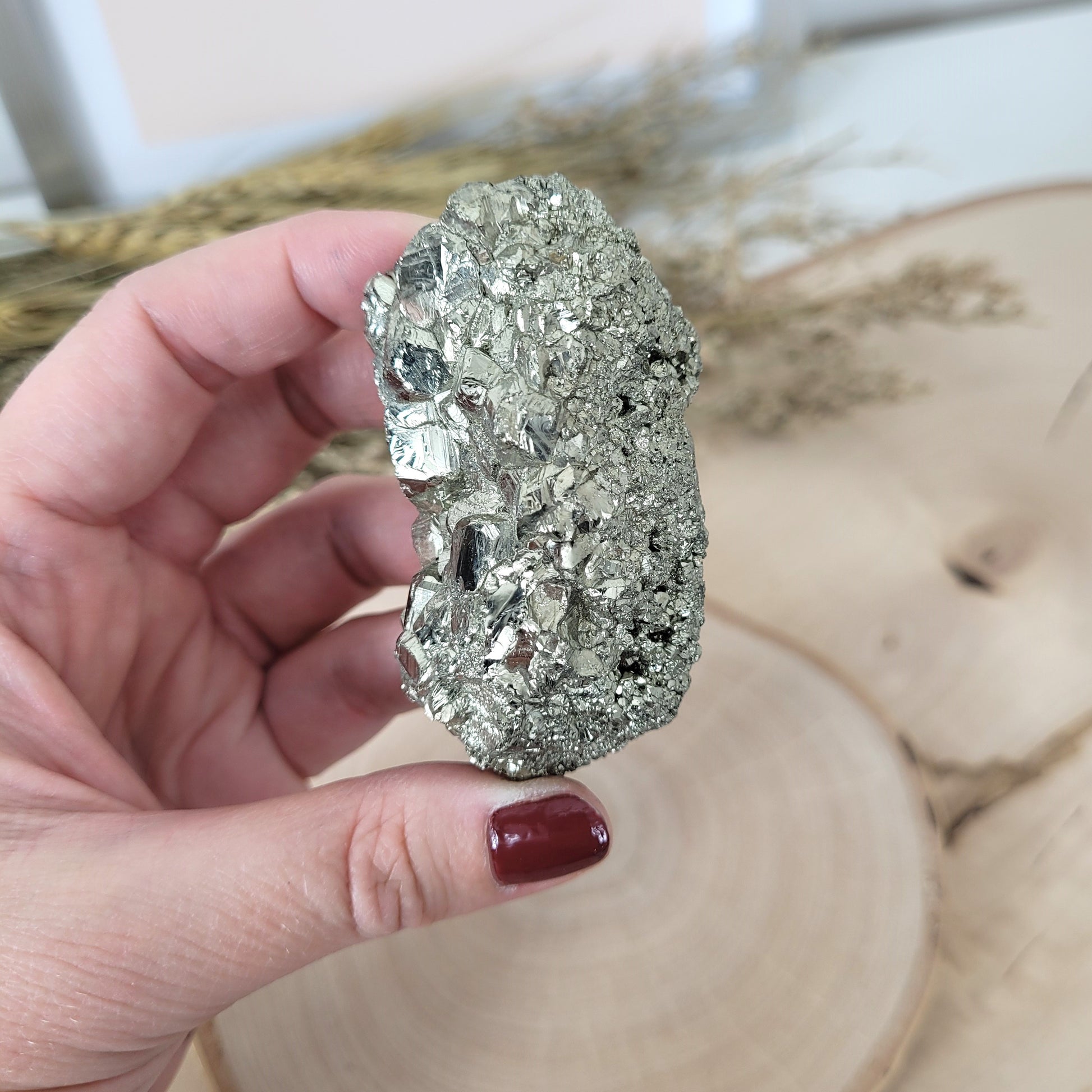 Die Pyrit Kristallstufe hat eine Größe von 6,5 x 3,3 cm und wiegt 121g. Es handelt sich genau um die Pyrit Kristallstufe, die auf den Bildern zu sehen ist.