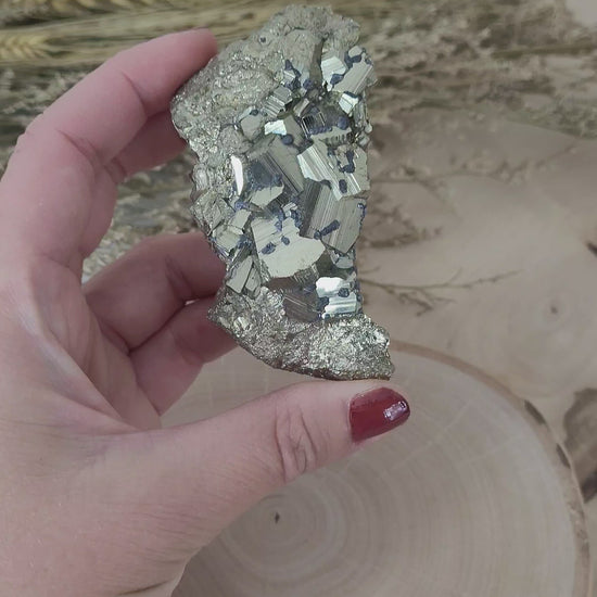 Die Pyrit Kristallstufe hat eine Größe von 8 x 3,5 cm und wiegt 203g. Es handelt sich genau um die Pyrit Kristallstufe, die auf den Bildern zu sehen ist.