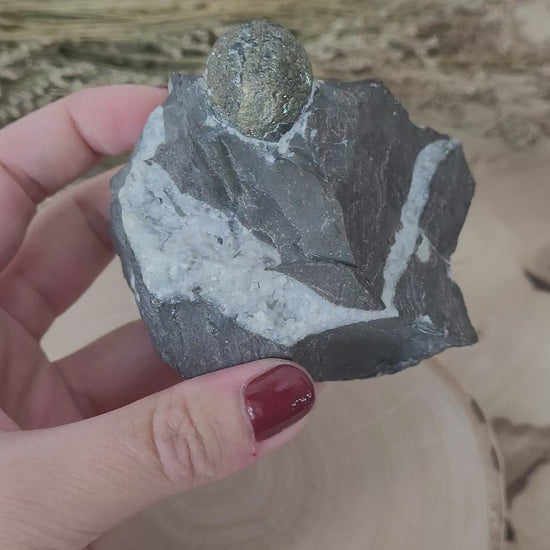 Ein wundervolles Exemplar alpiner Schönheit! Die mikrokleinen Pyrit Kristalle sind in Kugelform verwachsen auf dem Muttergestein/Quarz. Diese Art der Pyrite in Naturform als Kugel verwachsen, wurden in früheren Zeiten zum Feuer entfachen verwendet. Ein wunderschönes Sammlerstück.