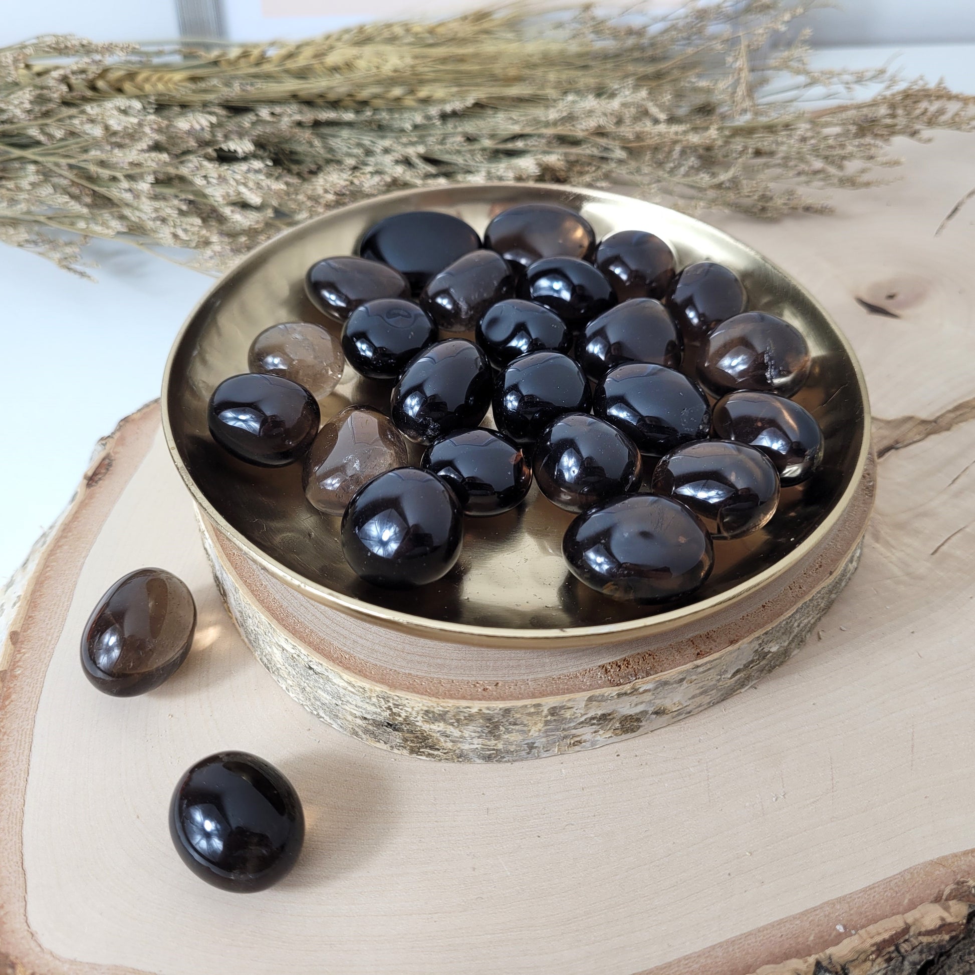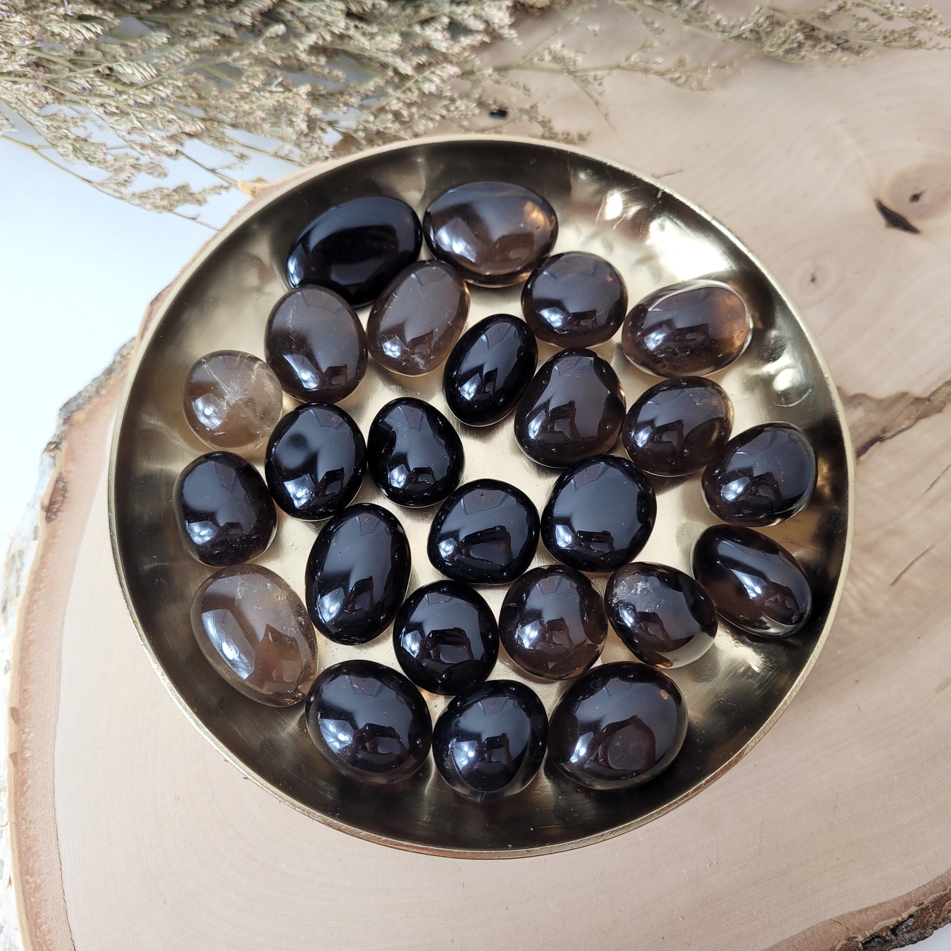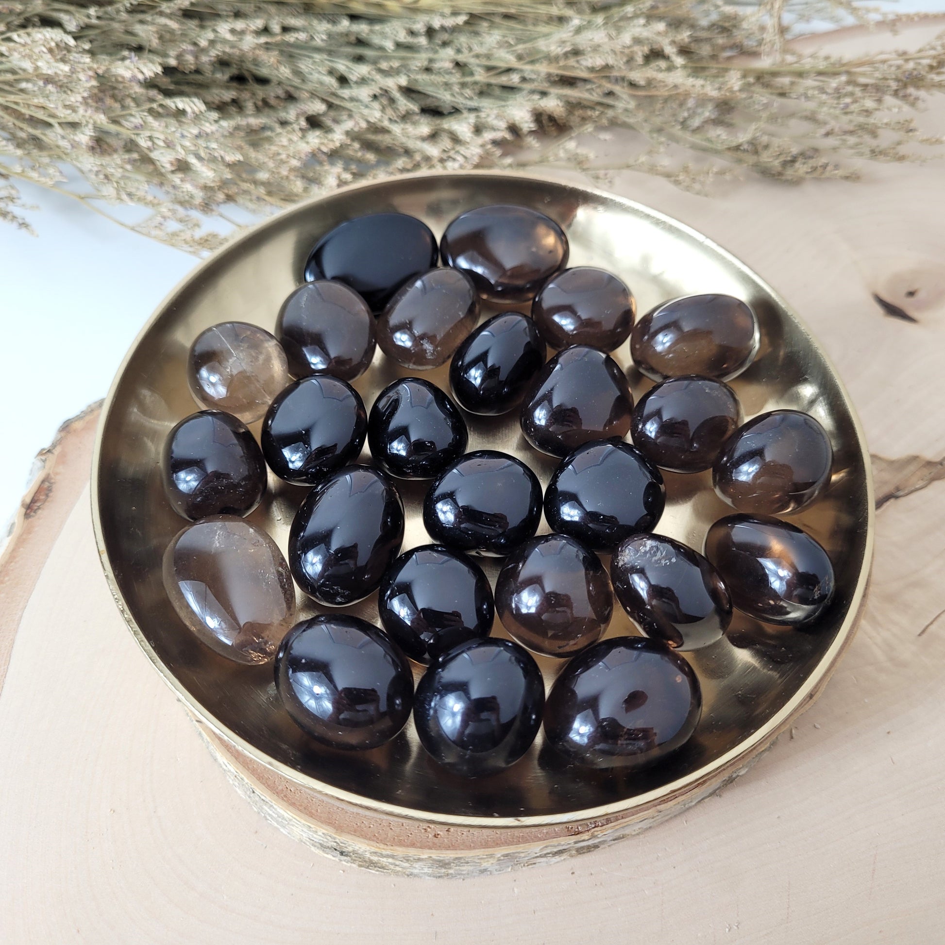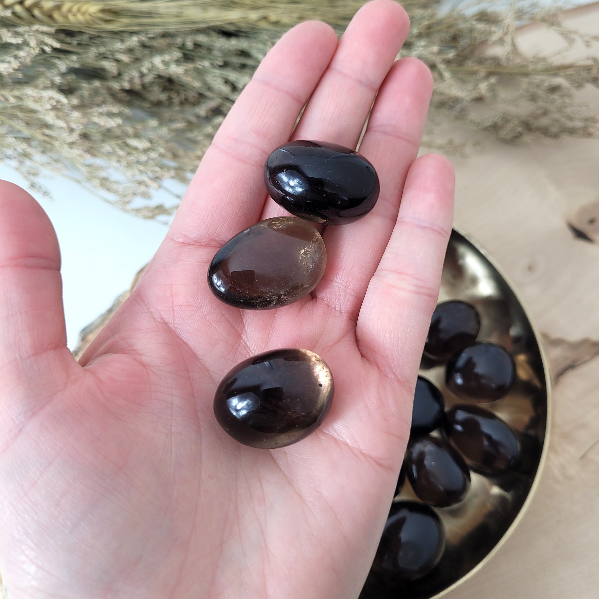 Diese Rauchquarz Trommelsteine faszinieren mit ihrer besonders klaren Kristallstruktur, ihr tief braunen rauchigen bis schon schwarzer Farbgebung und ihrem honigfarbenen Leuchten bei Lichteinfall in das Kristallinnere.