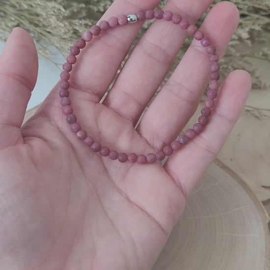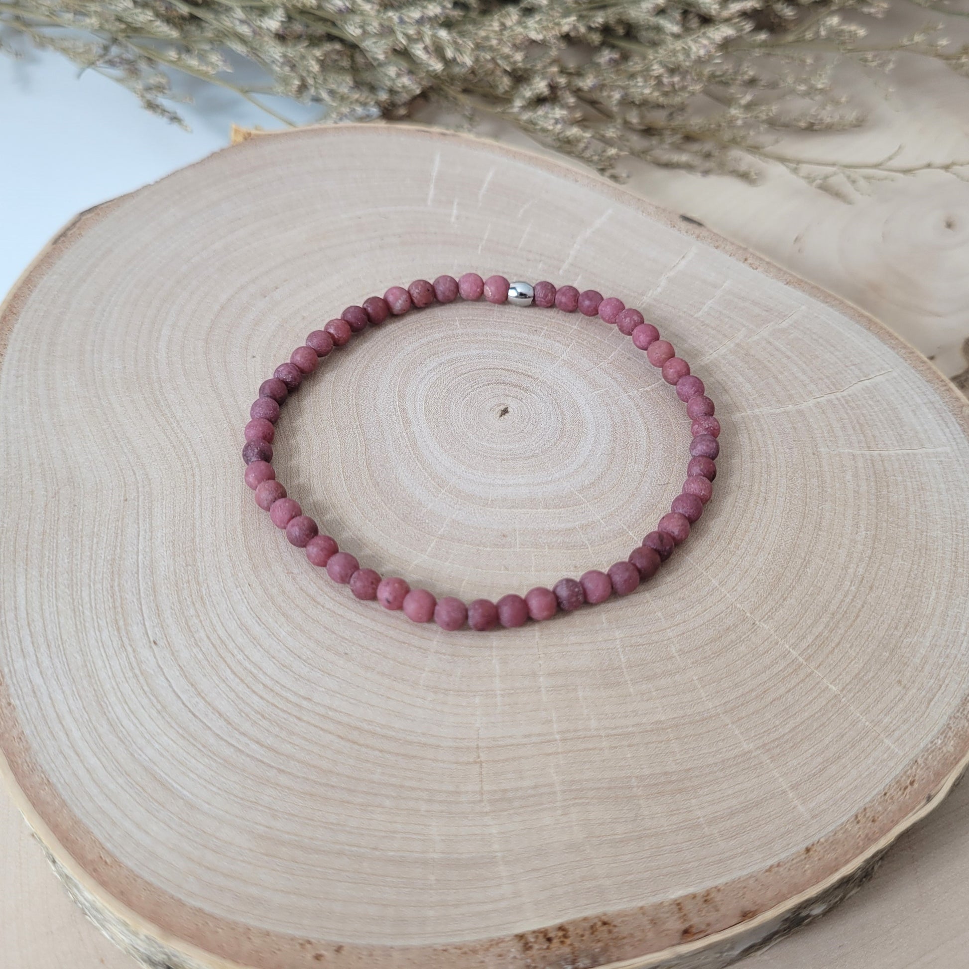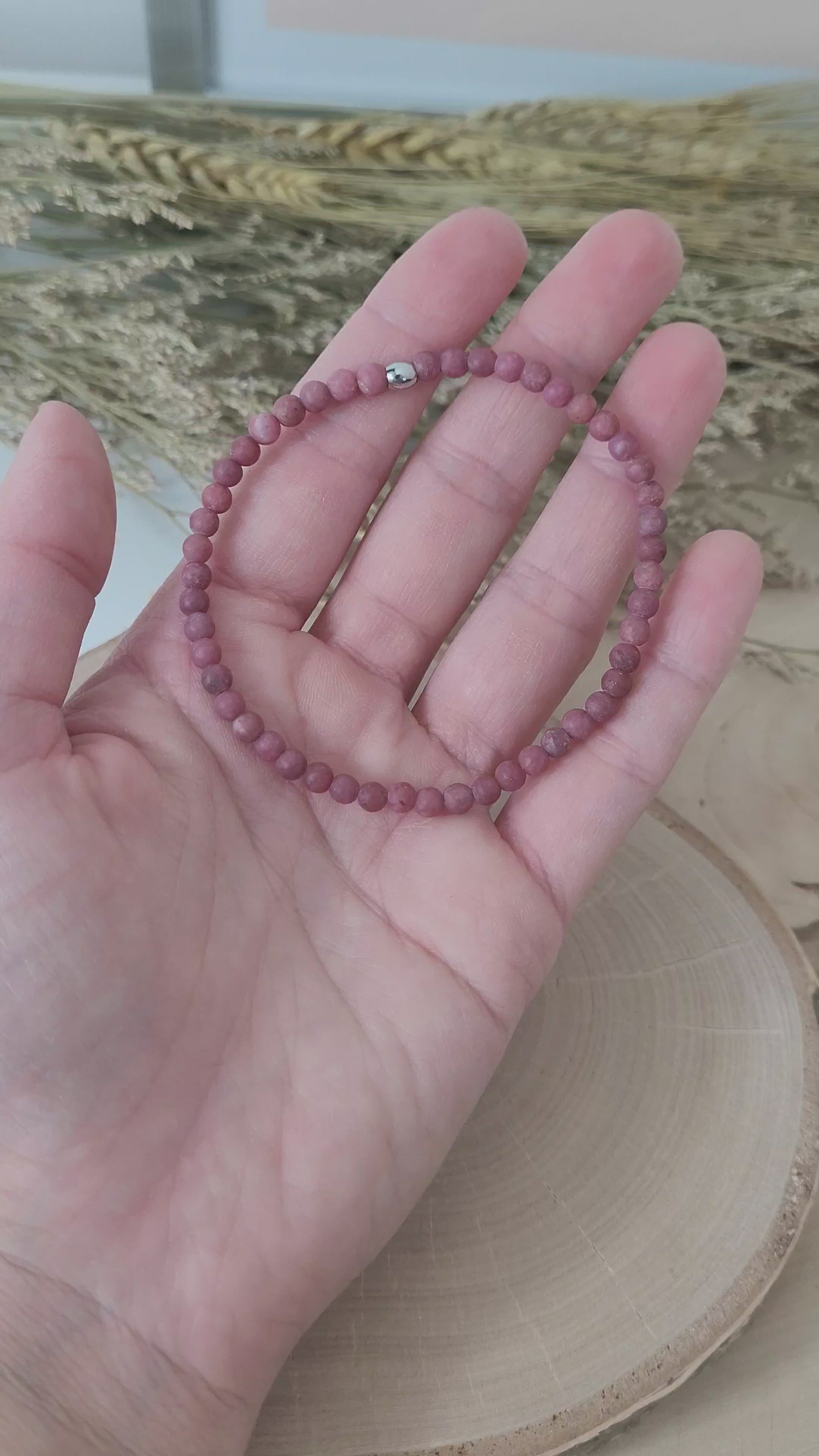 Elastisches Armband aus 4 mm Rhodonit Perlen in matt (Rohstein nicht poliert) und einer Endperle (zum eleganten Kaschieren des Endknotens) aus hochwertigem Edelstahl (rostfrei, wasserfest). Armbandlänge ca. 19 cm.
