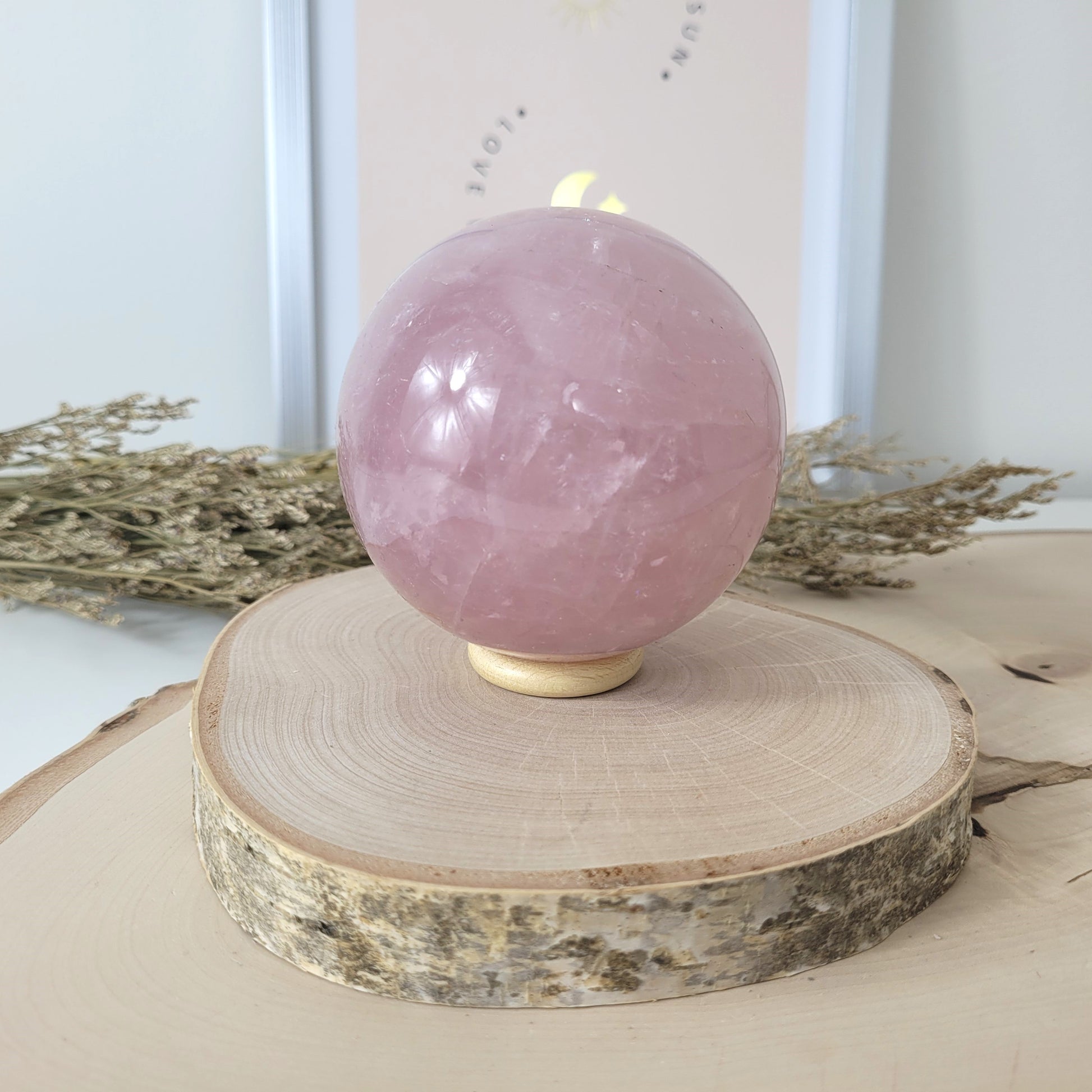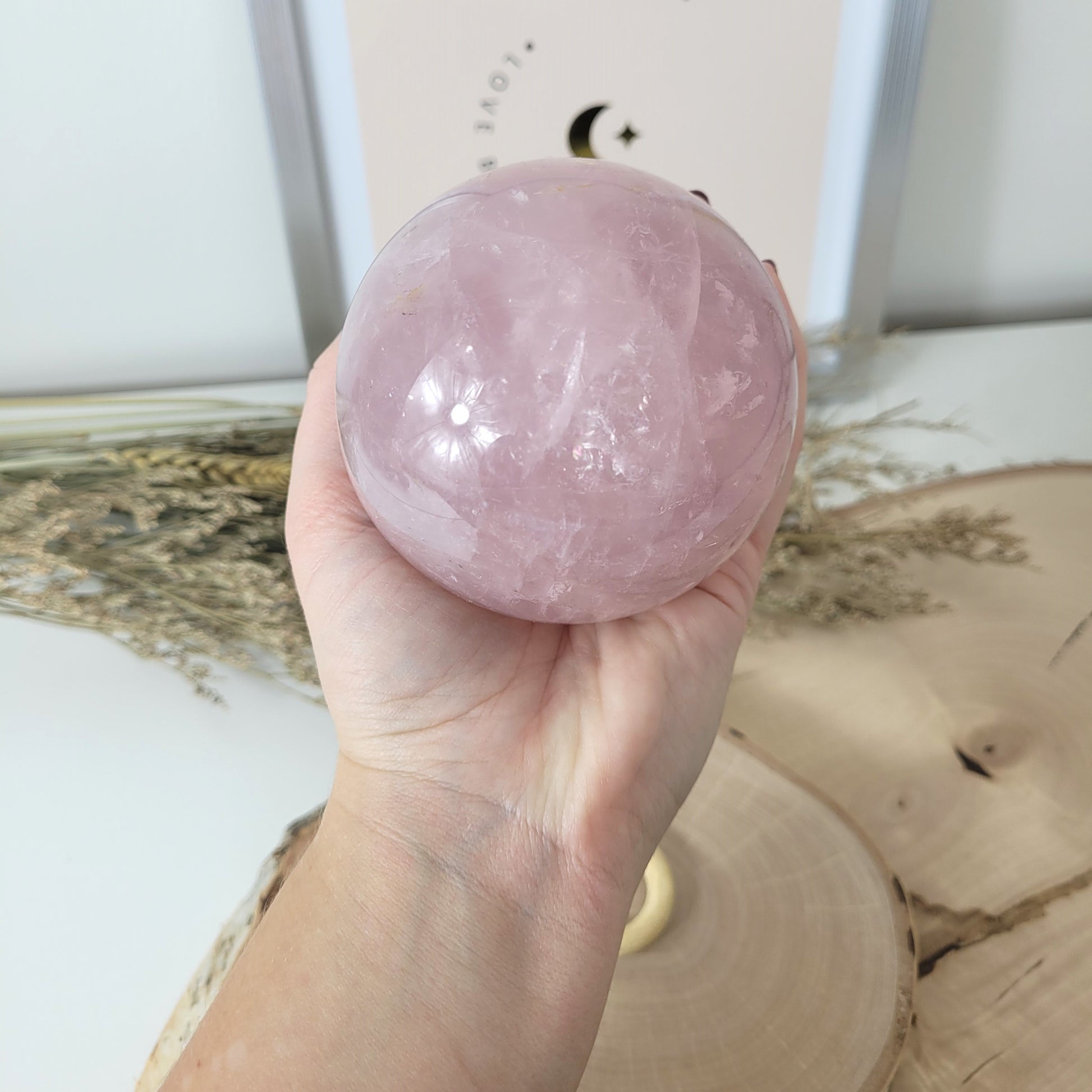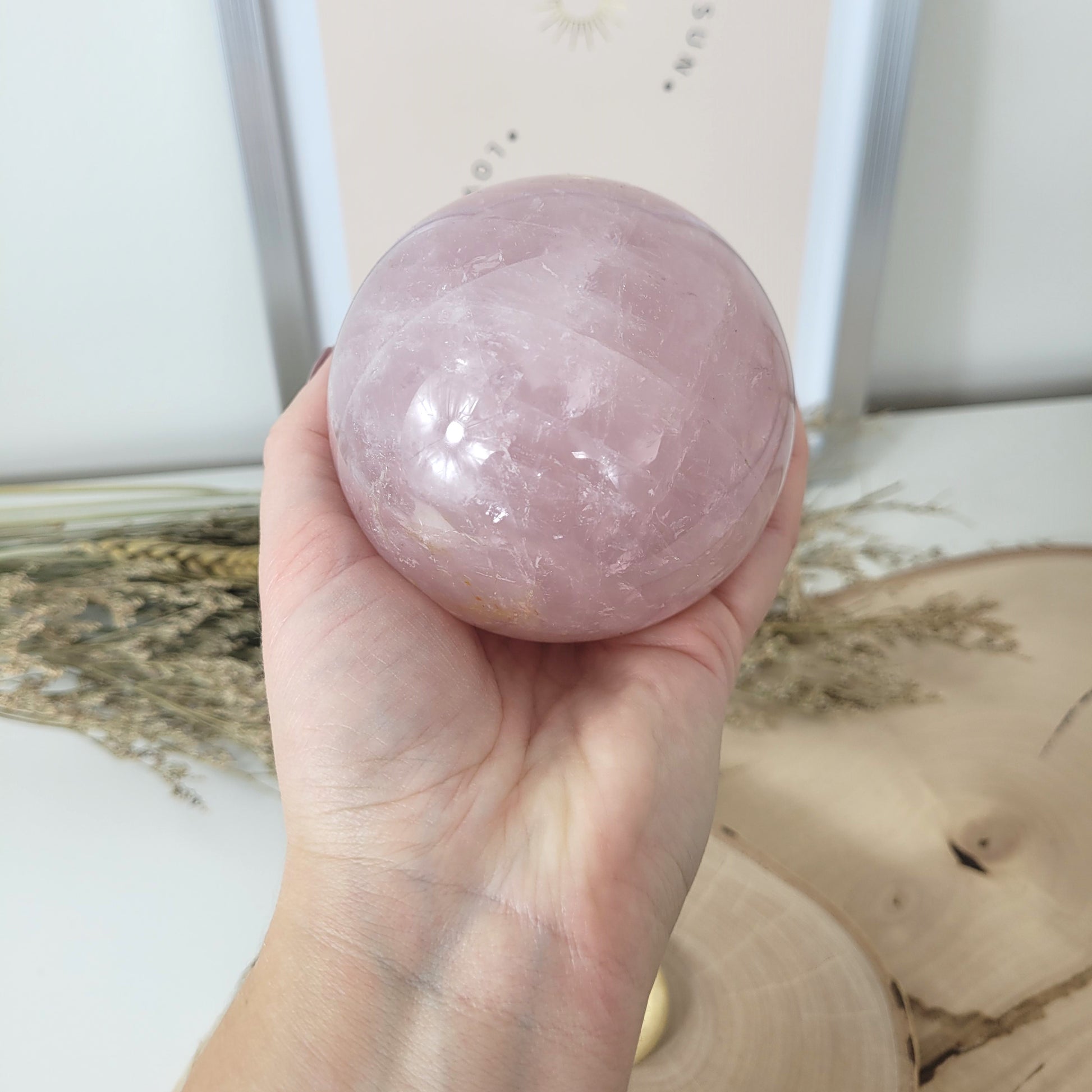 Die Rosenquarz Kugel hat einen Durchmesser von 8,3 cm und wiegt 817g. Es handelt sich genau um die Kugel, die auf den Bildern zu sehen ist.