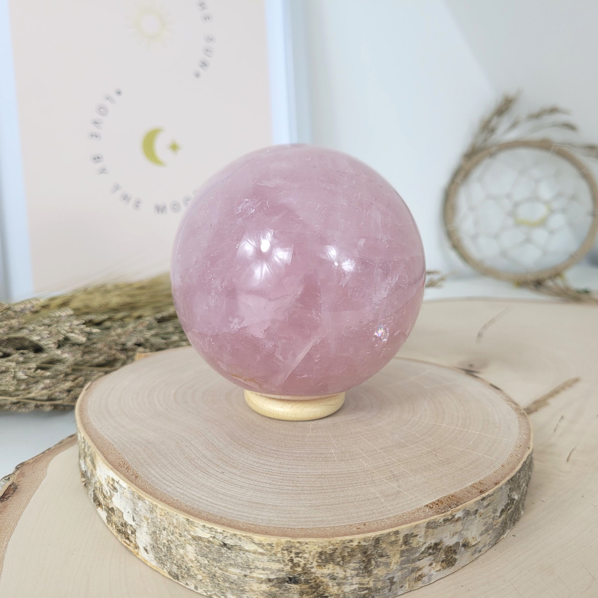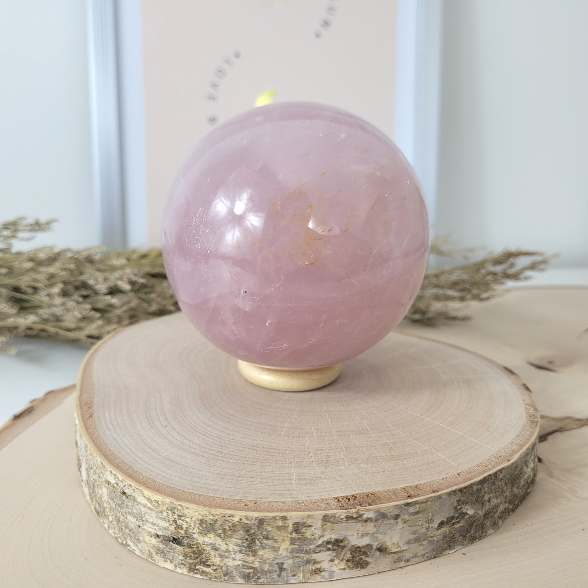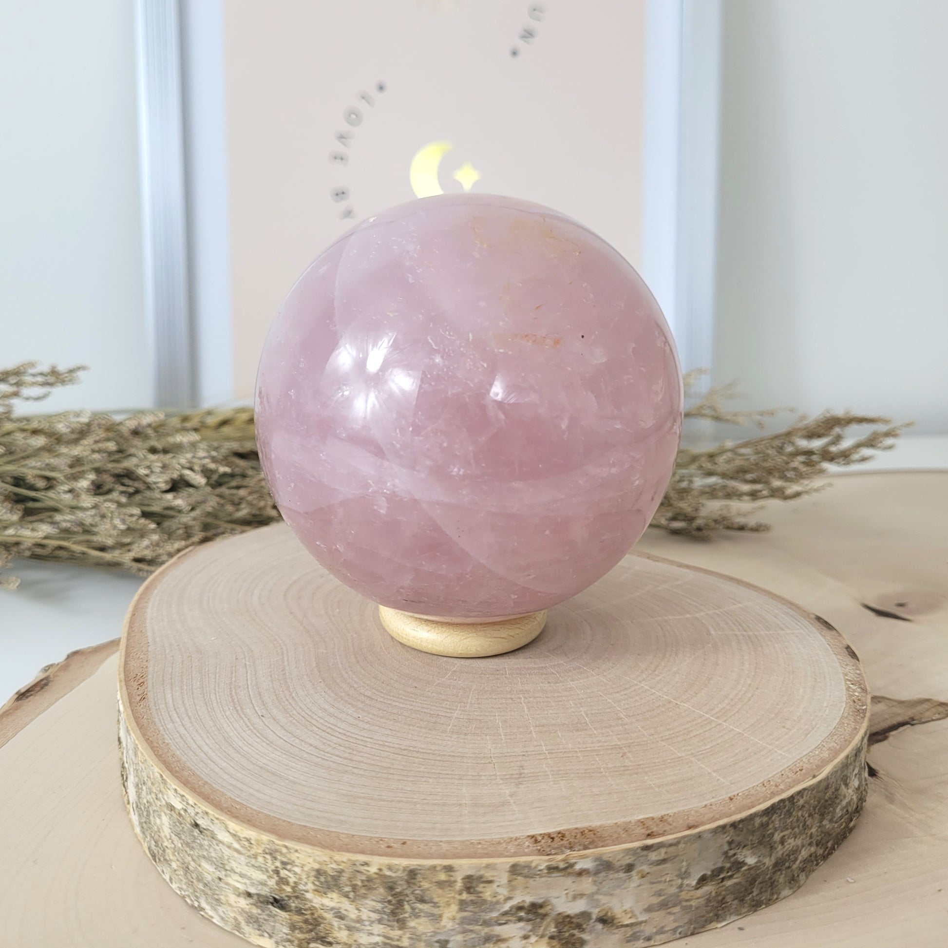 Die Rosenquarz Kugel hat einen Durchmesser von 8,3 cm und wiegt 817g. Es handelt sich genau um die Kugel, die auf den Bildern zu sehen ist.