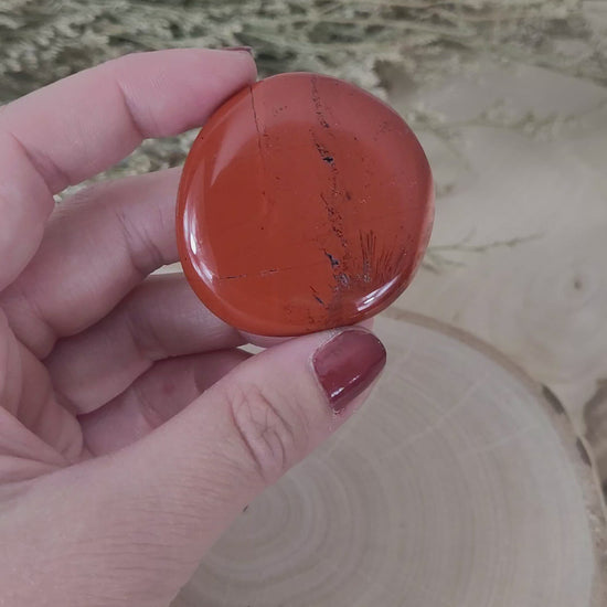 Dieser wunderschöne rote Jaspis Scheibenstein fasziniert mit seiner intensiven roten Naturfarbe, teils mit seiner schwarzen Maserung über das Gestein, teils mit seinen Quarzeinschlüssen. Der Scheibenstein ist als Handstein rundum flach poliert.