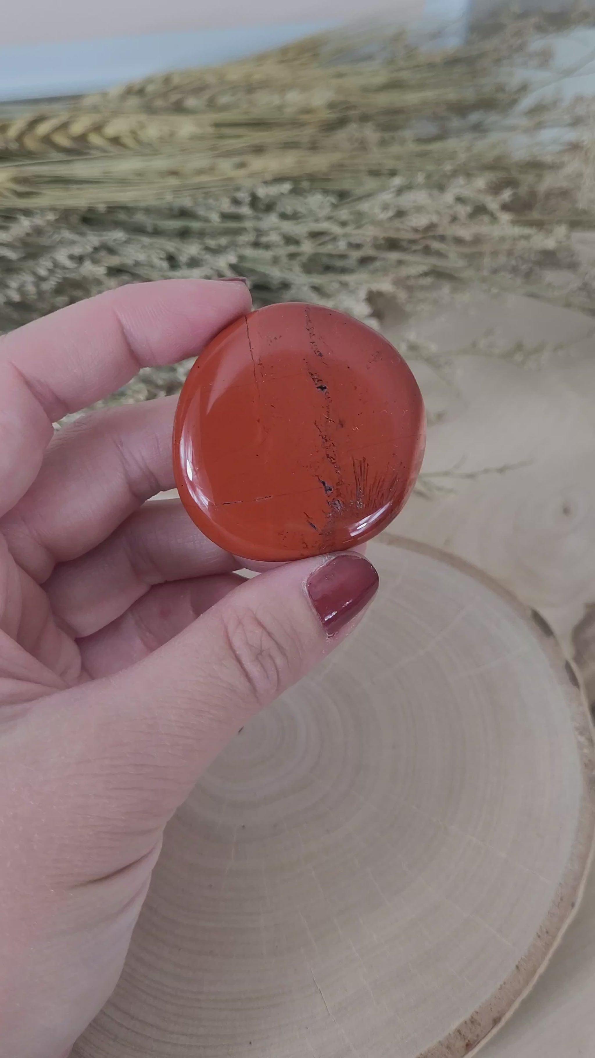 Der rote Jaspis Scheibenstein hat einen Durchmesser von ca. 4cm. Es handelt sich genau um den Scheibenstein, der auf den Bildern zu sehen ist.