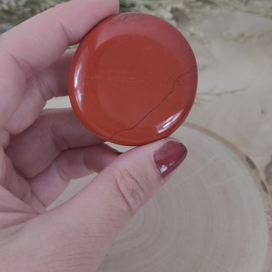 Dieser wunderschöne rote Jaspis Scheibenstein fasziniert mit seiner intensiven roten Naturfarbe, teils mit seiner schwarzen Maserung über das Gestein, teils mit seinen Quarzeinschlüssen. Der Scheibenstein ist als Handstein rundum flach poliert.