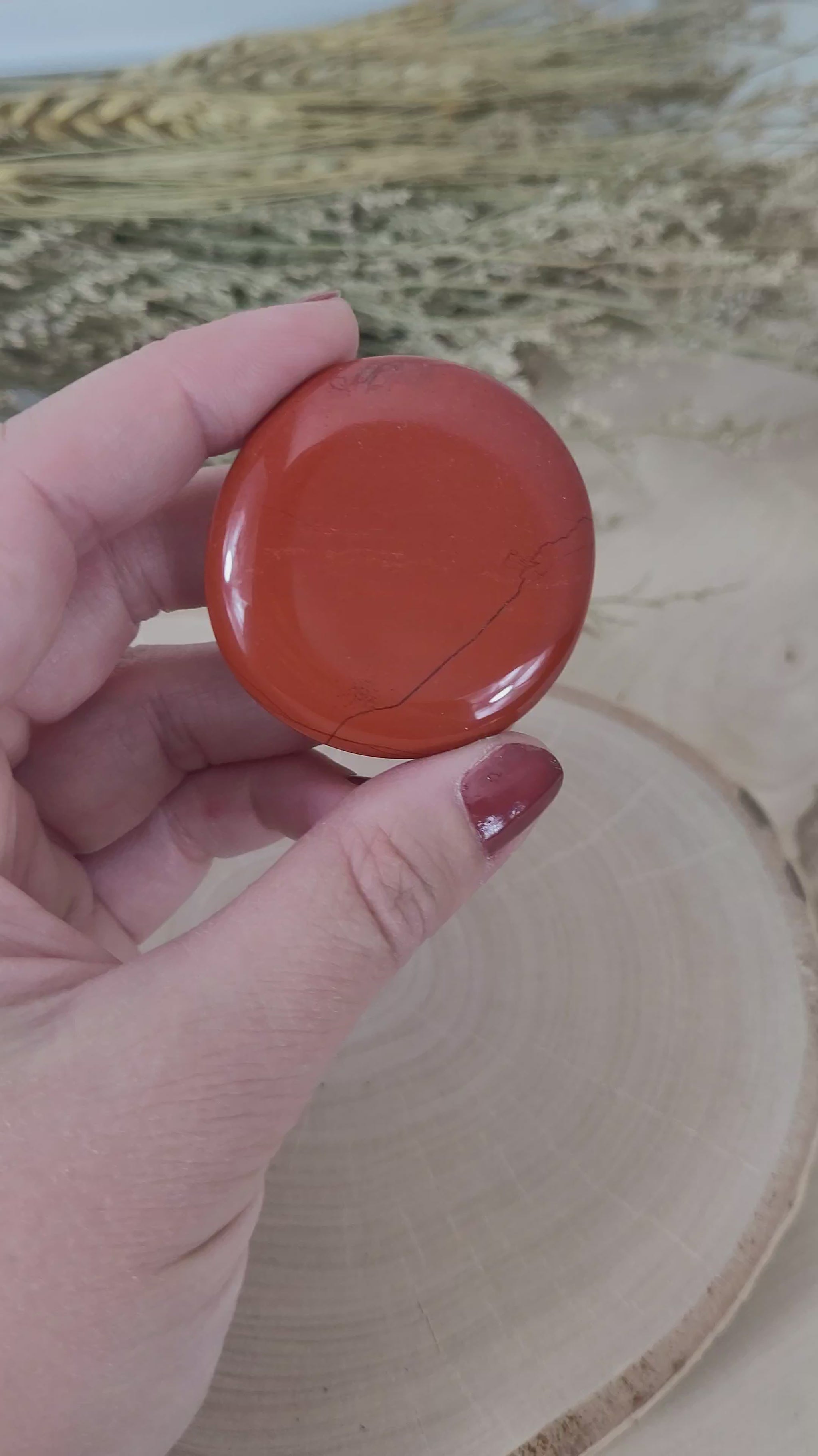 Der rote Jaspis Scheibenstein hat einen Durchmesser von ca. 4cm. Es handelt sich genau um den Scheibenstein, der auf den Bildern zu sehen ist.