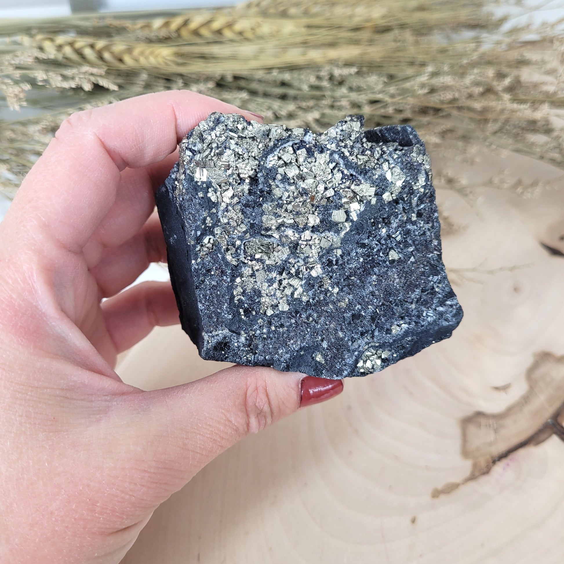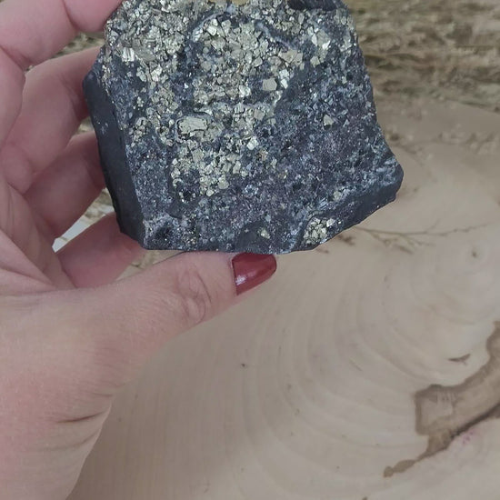 Dieser Schungit ist in seiner Form komplett naturbelassen und nicht poliert, nur lediglich mit einer Standfläche versehen. Dieser Schungit fasziniert mit seinen zahlreichen Pyrit Kristallen, die auf ihm verwachsen sind und teils auch aderartig durch das Gestein verlaufen.