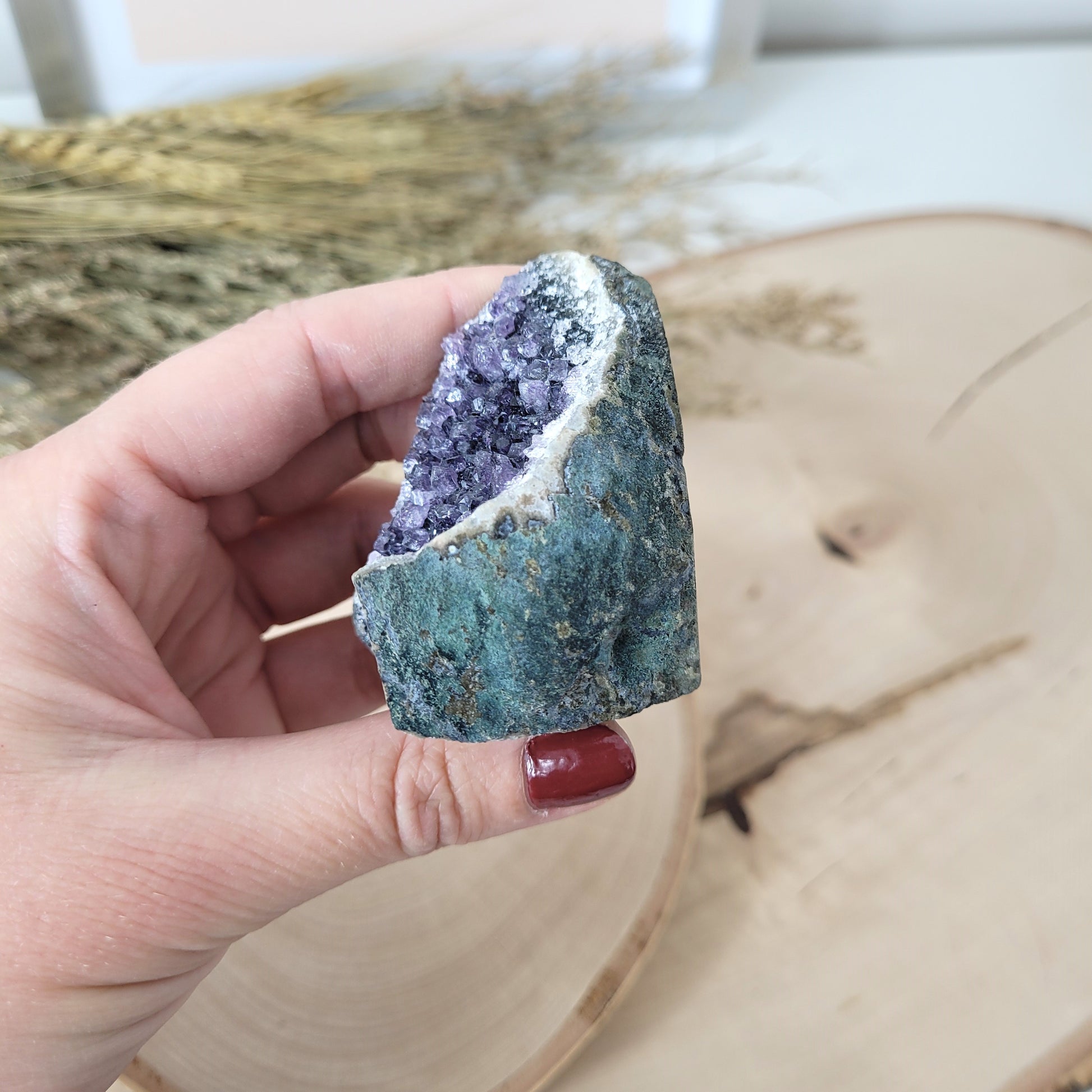 Dieses Kristalldruse schwarzer Amethyst ist in ihrer Form komplett naturbelassen und mit einer Standfläche versehen. Bei der Farbgebung des schwarzen Amethysts handelt es sich um seine Naturfarbe, welche von, rötlich, blass violett über grau, grünlich bis hin zu tiefen schwarz gehen kann.