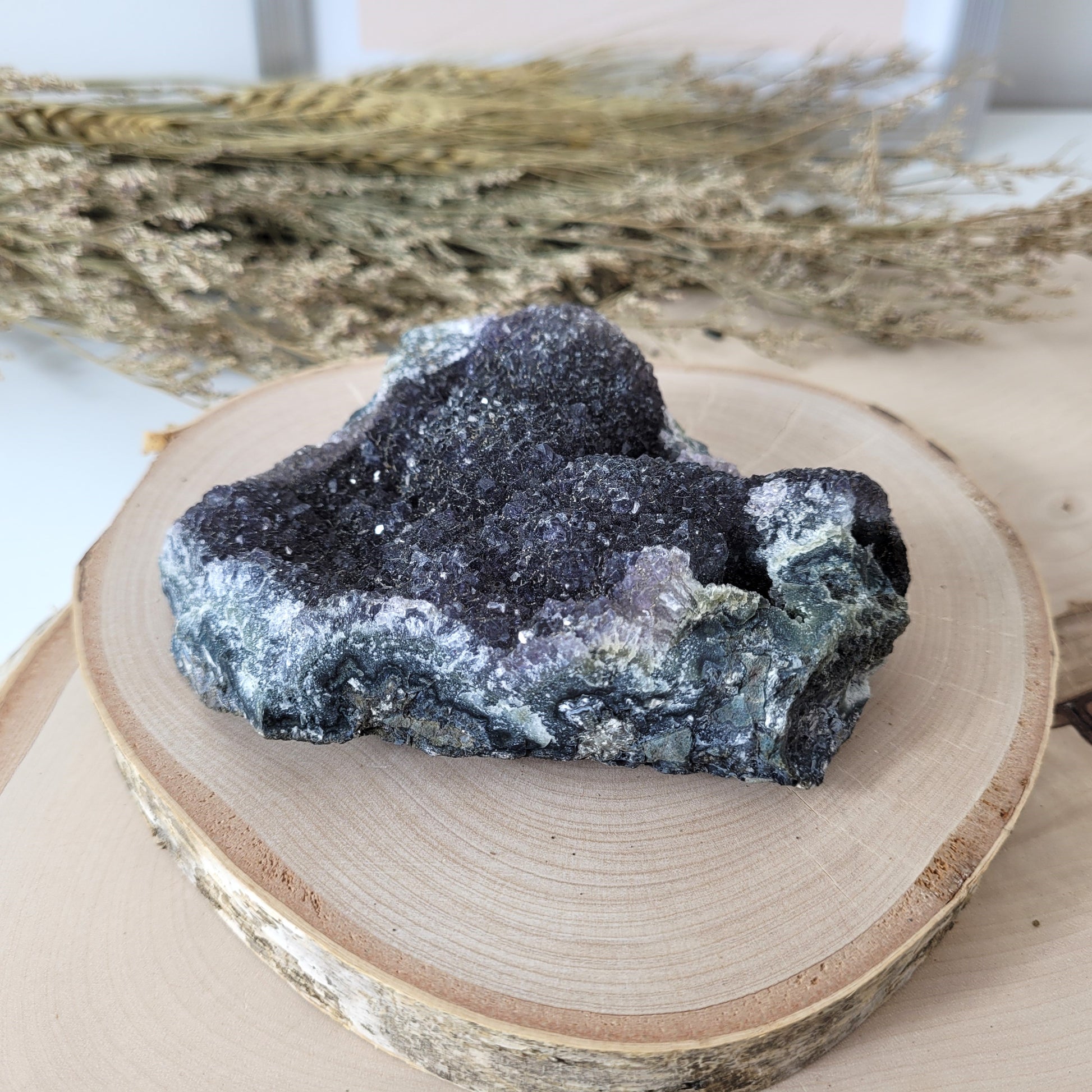 Dieses Kristalldruse schwarzer Amethyst ist in ihrer Form komplett naturbelassen und liegend. Bei der Farbgebung des schwarzen Amethysts handelt es sich um seine Naturfarbe, welche von, rötlich, blass violett über grau, grünlich bis hin zu tiefen schwarz gehen kann.