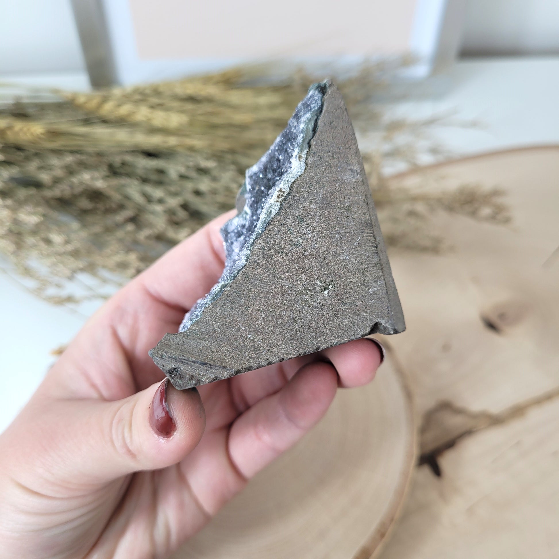Dieses Kristalldruse schwarzer Amethyst ist in ihrer Form komplett naturbelassen und mit einer Standfläche versehen. Bei der Farbgebung des schwarzen Amethysts handelt es sich um seine Naturfarbe, welche von, rötlich, blass violett über grau, grünlich bis hin zu tiefen schwarz gehen kann.
