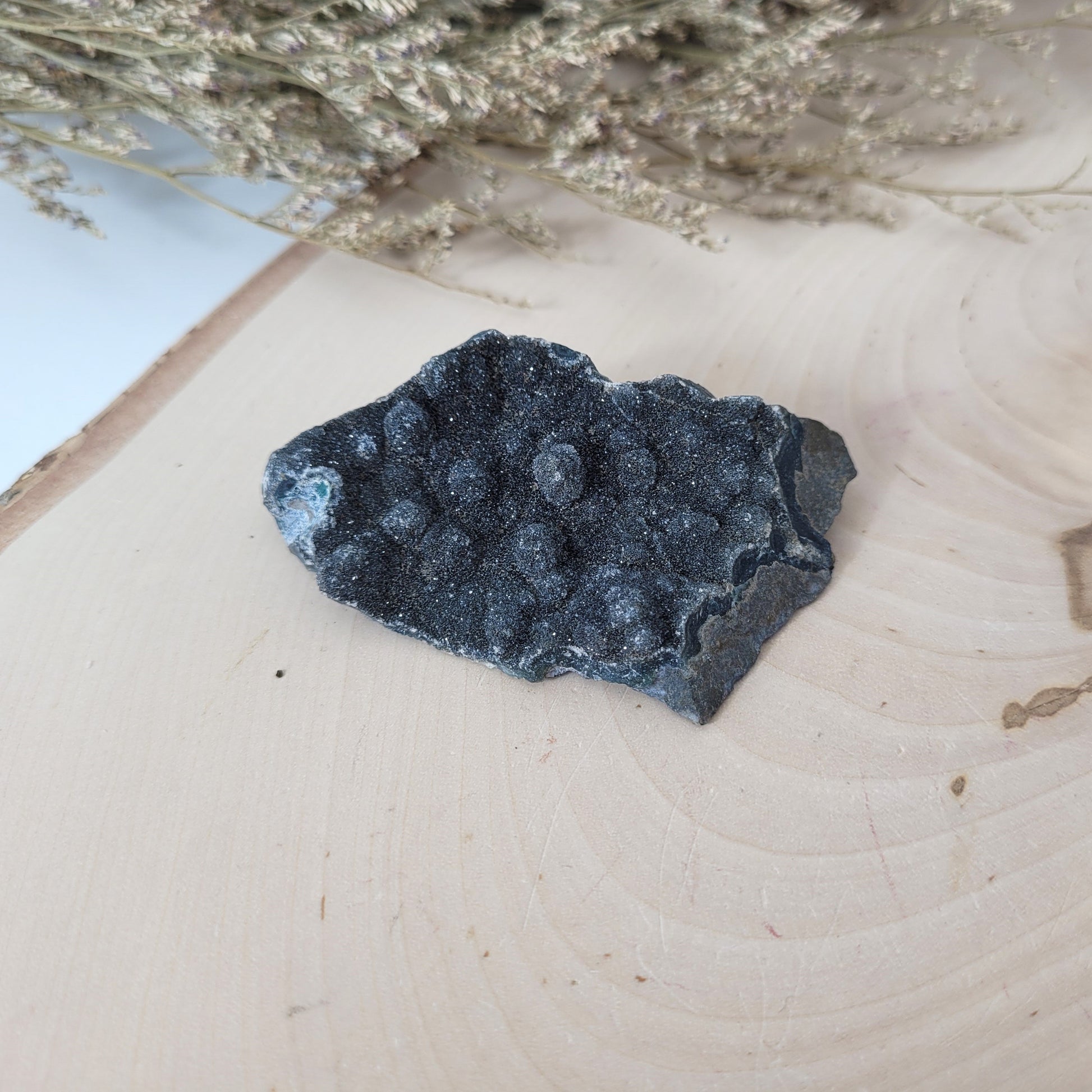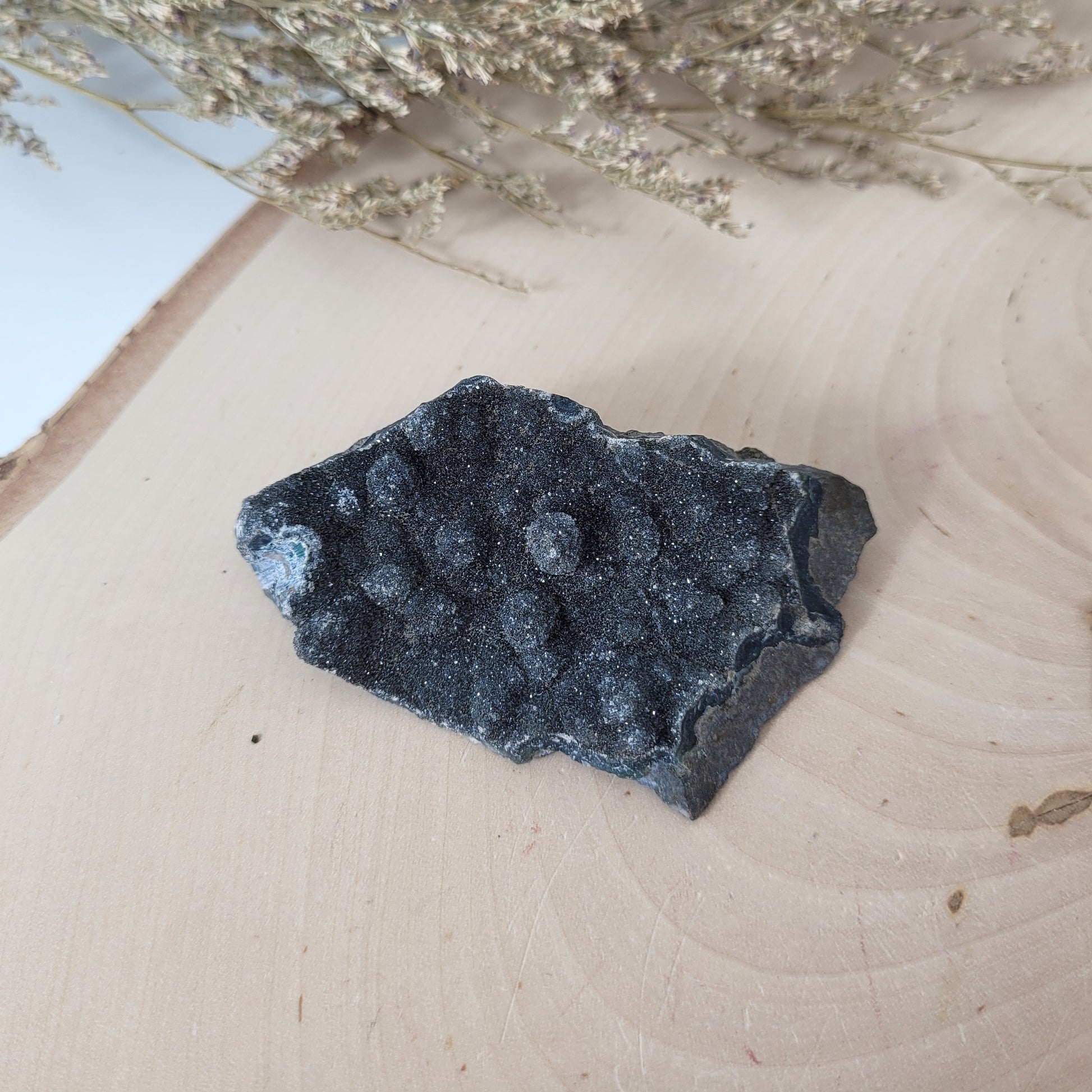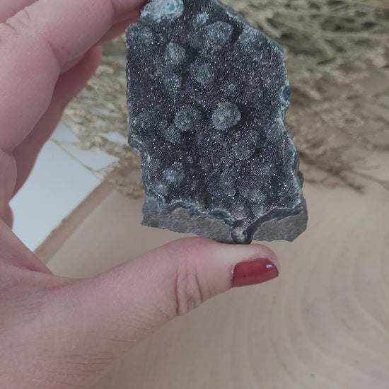 Schwarzer Amethyst ist eher selten. Die Farbveränderung von violett auf schwarz findet durch natürliche Prozesse im Erdinneren statt meist durch enorme Hitze und Druckeinflüsse im Entstehungsprozess des Amethysts vor Millionen von Jahren. Schwarzer Amethyst zeichnet sich zudem damit aus, dass die Kristallbildung also die einzelnen Kristallspitzen der Druse sehr klein sind und so ein wundervolles Funkeln über die gesamte Kristalldruse entsteht.