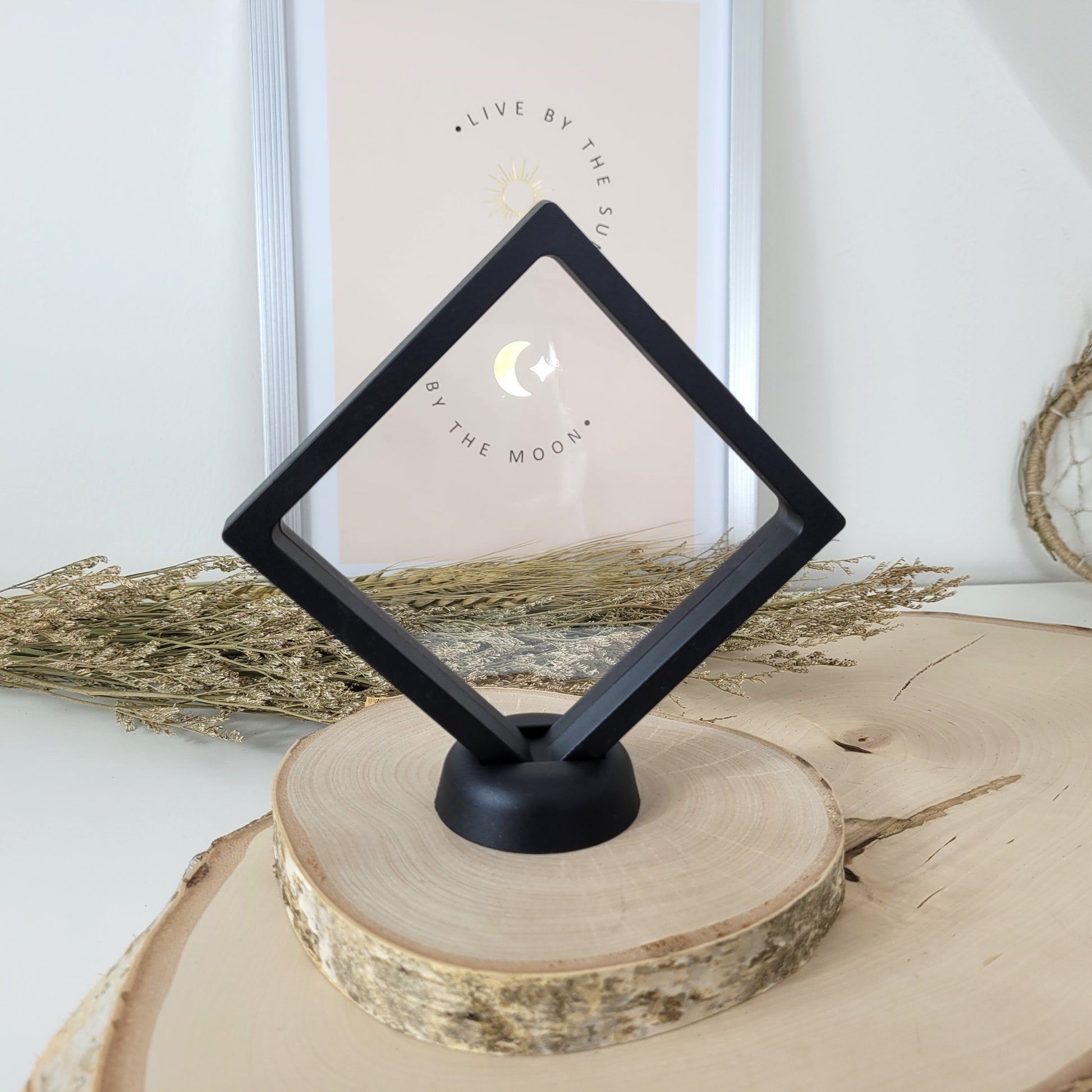 Schweberahmen für kleine Mineralien und Kristalle. Die kleineren Steinschätze optimal in Szene setzen. Natürlich können auch mehrere kleine Mineralien im Inneren des Schweberahmens dekoriert werden. Ideal zu Präsentation von Mineralien, Fossilien und Schmuckstücken. Natürlich auch für eine kreative Ideen wie Blätter, Blüten, Münzen oder Bilder.
