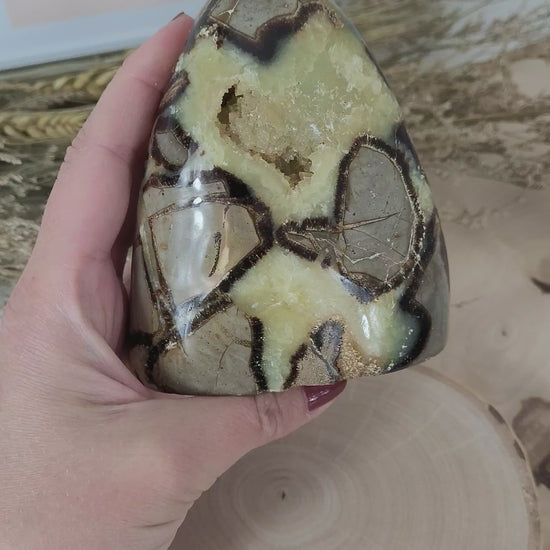 Diese Septarien Freiform hat eine Größe von 10x8,2cm und wiegt 588g. Es handelt sich genau um die Septarien Freiform, die auf den Bildern zu sehen ist.